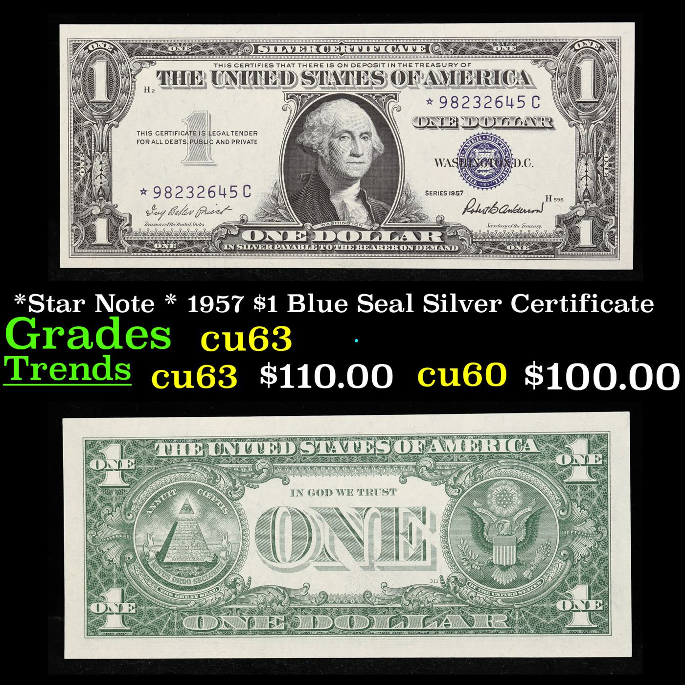 *Star Note * 1957 $1 Blue Seal Silver Certificate Grades Select CU. When notes are discovered that have been printed incorrectly (such as having the serial numbers upside down, etc.) the misprinted "error notes" are replaced with star notes because no two bills within a certain series can be produced with the same serial number. They are used to maintain a correct count of notes in a serial number run. By their nature, star notes are more scarce than notes with standard serial numbers and as such are widely collected by numismatists. Some of the highest prices paid for modern (post-1928) U.S. banknotes have been for star notes. The note itself is a Silver Certificate. Silver Certificates were redeemable in Silver. One of their most distinctive qualities is the blue Treasury seal and serial numbers. These notes include an additional legend printed on the face that is not present on any other Federal Reserve notes. The legend states that Silver had been deposited in the Treasury and was payable on demand to the note’s bearer.