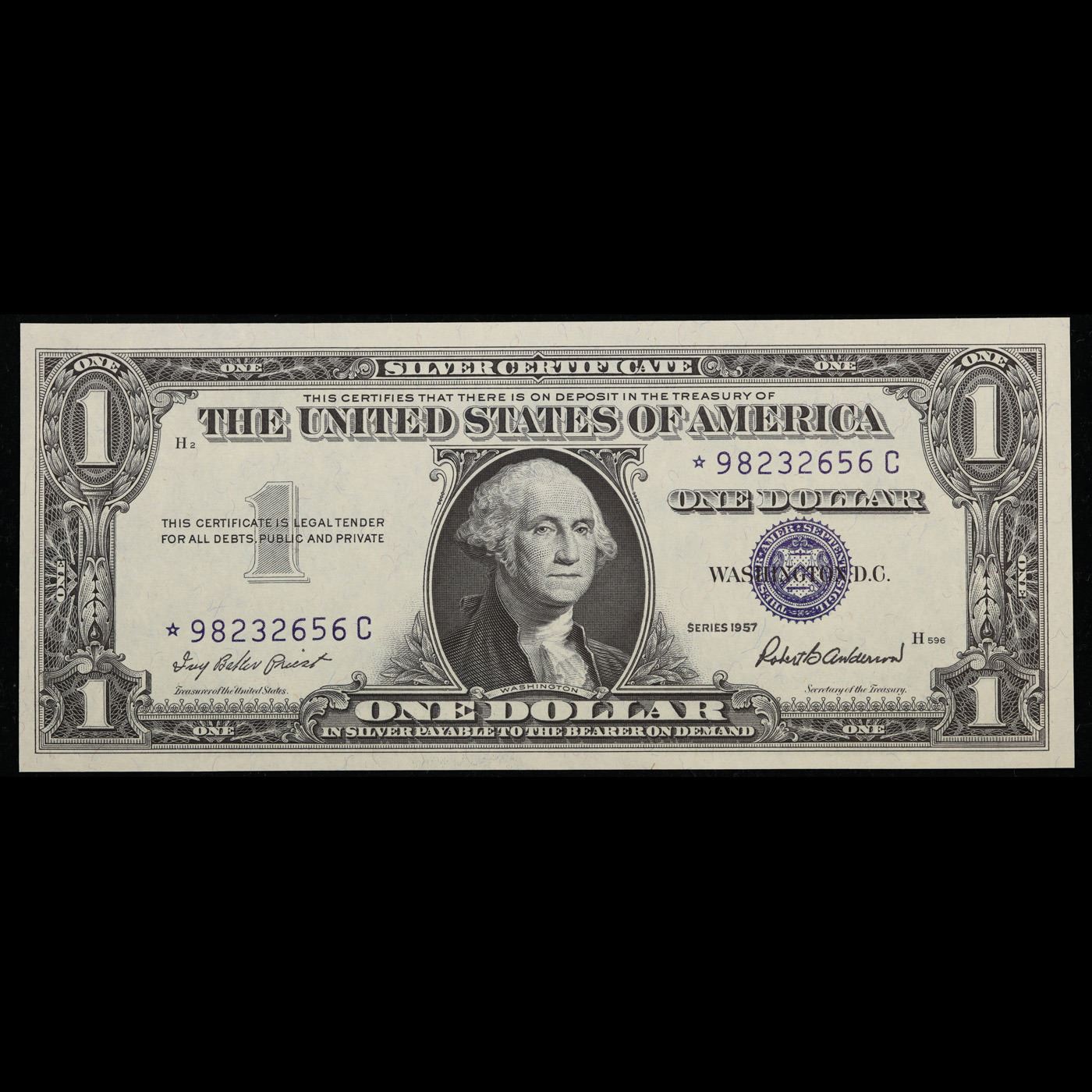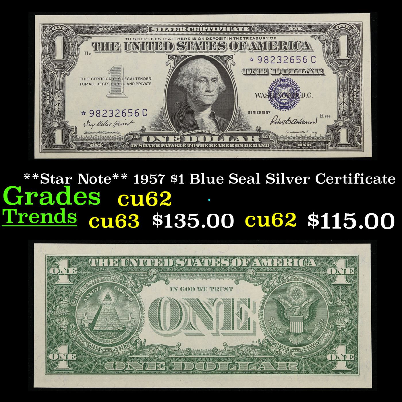 **Star Note** 1957 $1 Blue Seal Silver Certificate Grades Select CU. When a currency note is deemed imperfect in its manufacture, it is replaced with a Star Note which bears a star before or after the serial number. Star Notes are scarcer than regular issues, as only a limited number are produced and fewer still are placed in circulation. Silver Certificates, and in particular Star Note issues, are among the most sought-after U.S. currency notes.