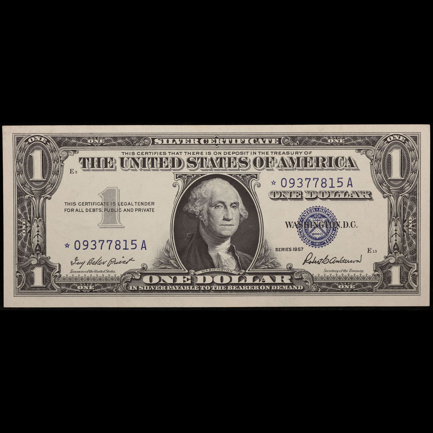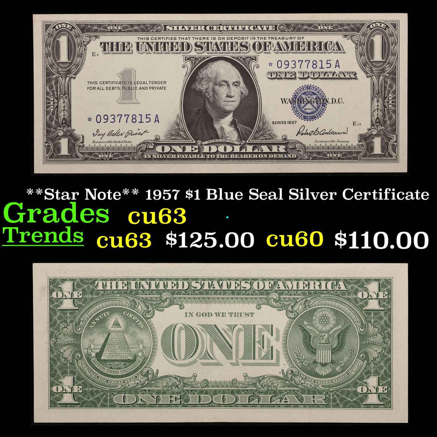 **Star Note** 1957 $1 Blue Seal Silver Certificate Grades Select CU. When notes are discovered that have been printed incorrectly (such as having the serial numbers upside down, etc.) the misprinted "error notes" are replaced with star notes because no two bills within a certain series can be produced with the same serial number. They are used to maintain a correct count of notes in a serial number run. By their nature, star notes are more scarce than notes with standard serial numbers and as such are widely collected by numismatists. Some of the highest prices paid for modern (post-1928) U.S. banknotes have been for star notes. The note itself is a Silver Certificate. Silver Certificates were redeemable in Silver. One of their most distinctive qualities is the blue Treasury seal and serial numbers. These notes include an additional legend printed on the face that is not present on any other Federal Reserve notes. The legend states that Silver had been deposited in the Treasury and was payable on demand to the note’s bearer.