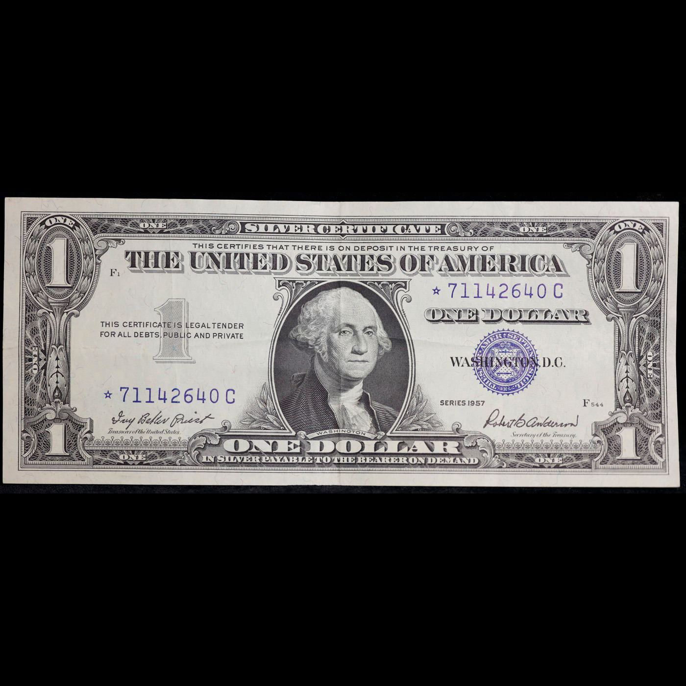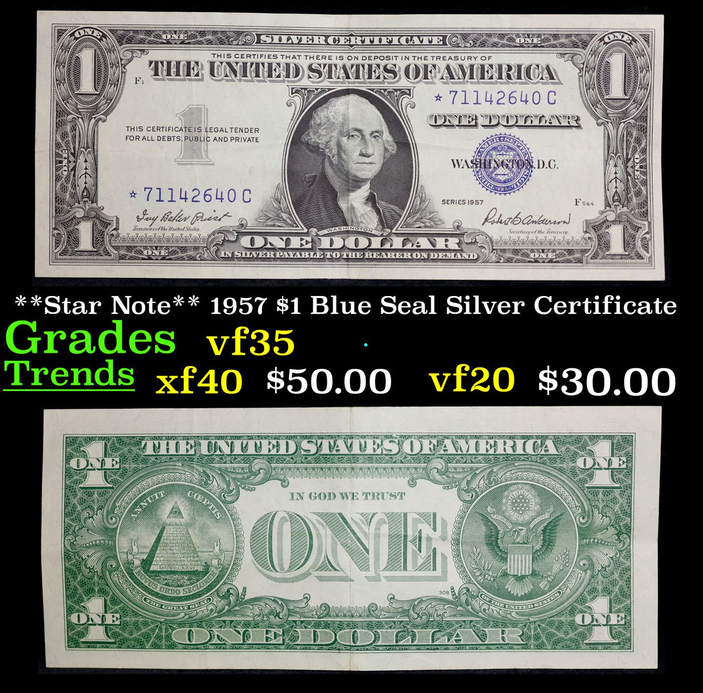 **Star Note** 1957 $1 Blue Seal Silver Certificate Grades vf++. When a currency note is deemed imperfect in its manufacture, it is replaced with a Star Note which bears a star before or after the serial number. Star Notes are scarcer than regular issues, as only a limited number are produced and fewer still are placed in circulation. . Silver Certificates, and in particular Star Note issues, are among the most sought-after U.S. currency notes.