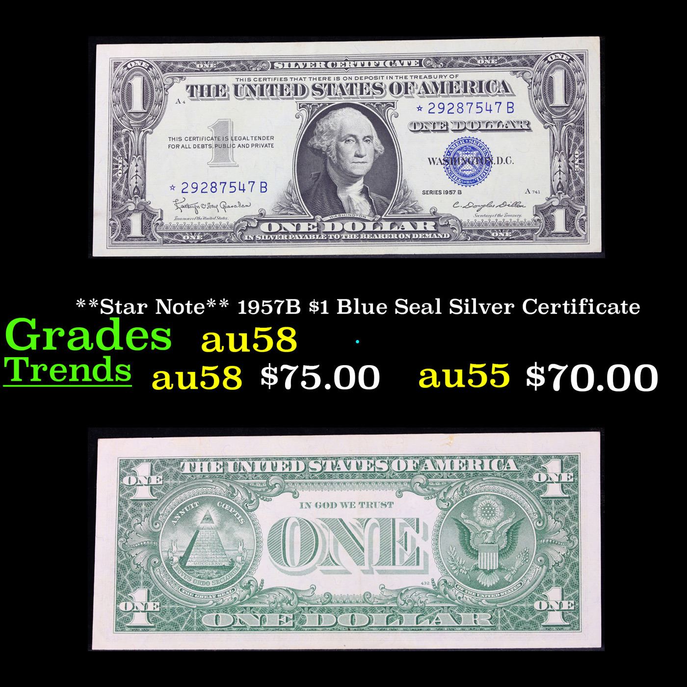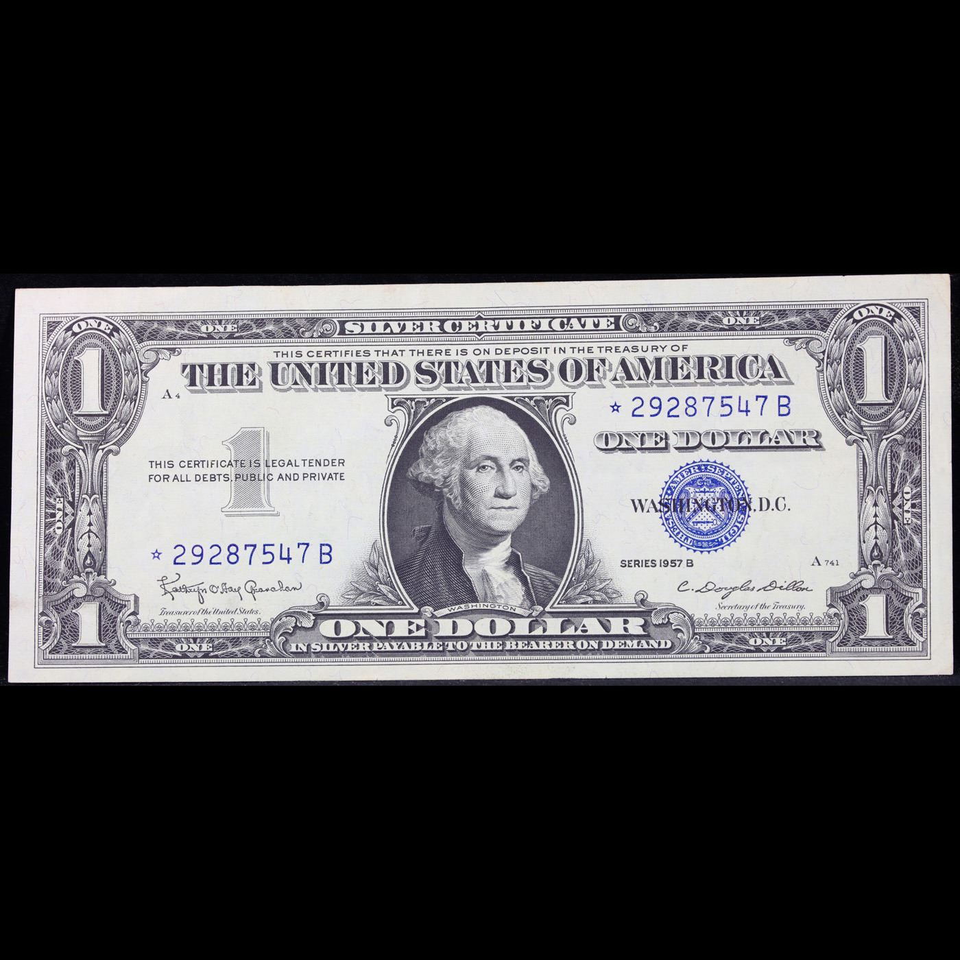 **Star Note** 1957B $1 Blue Seal Silver Certificate Grades Choice AU/BU Slider. On June 4th 1963, President Kennedy issued Executive Order 11110, ordering that silver certificates be phased out. No one knew it would be his last executive order, and no one knew that it would make these 1957-B Silver Certificates sought-after collectibles today. His order caused folks to take notice and save a small number of these 1957-B $1 Silver Certificates-they were only 14% of the total 1957 Silver Certs printed. These silver certificates feature George Washington, a blue seal, and the following wording: “Silver Certificate This certifies that there is on deposit in the treasury of The United States of America One Dollar In silver payable on demand”