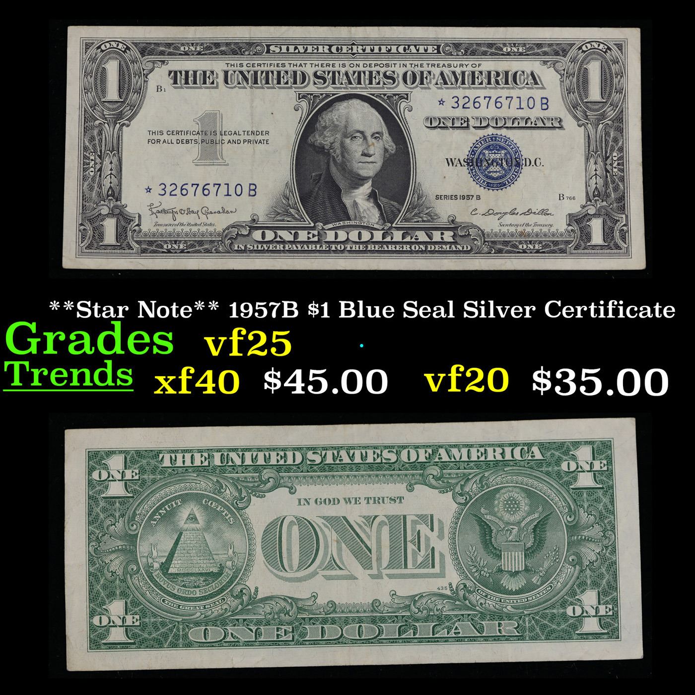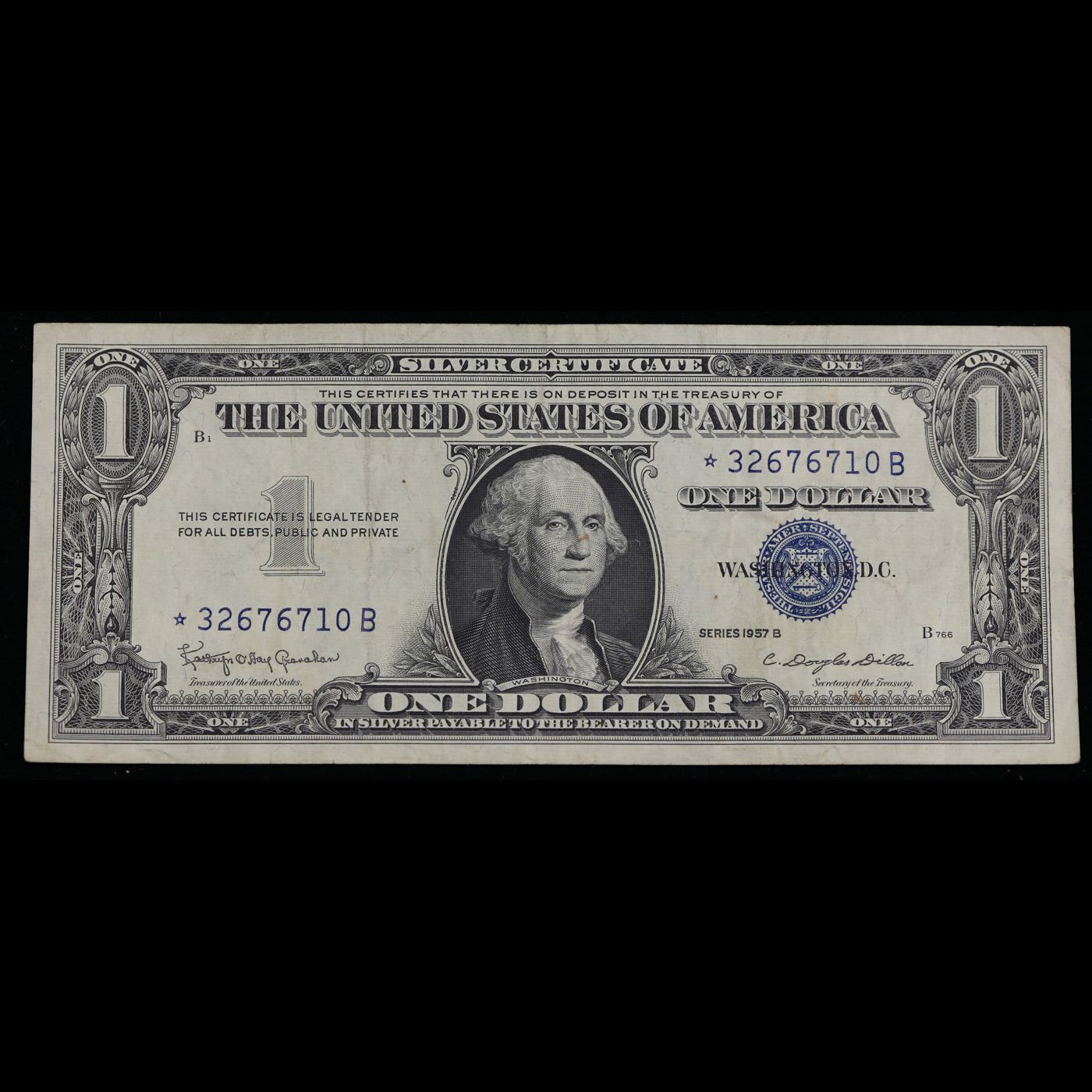 **Star Note** 1957B $1 Blue Seal Silver Certificate Grades vf+. On June 4th 1963, President Kennedy issued Executive Order 11110, ordering that silver certificates be phased out. No one knew it would be his last executive order, and no one knew that it would make these 1957-B Silver Certificates sought-after collectibles today. His order caused folks to take notice and save a small number of these 1957-B $1 Silver Certificates-they were only 14% of the total 1957 Silver Certs printed. These silver certificates feature George Washington, a blue seal, and the following wording: “Silver Certificate This certifies that there is on deposit in the treasury of The United States of America One Dollar In silver payable on demand”