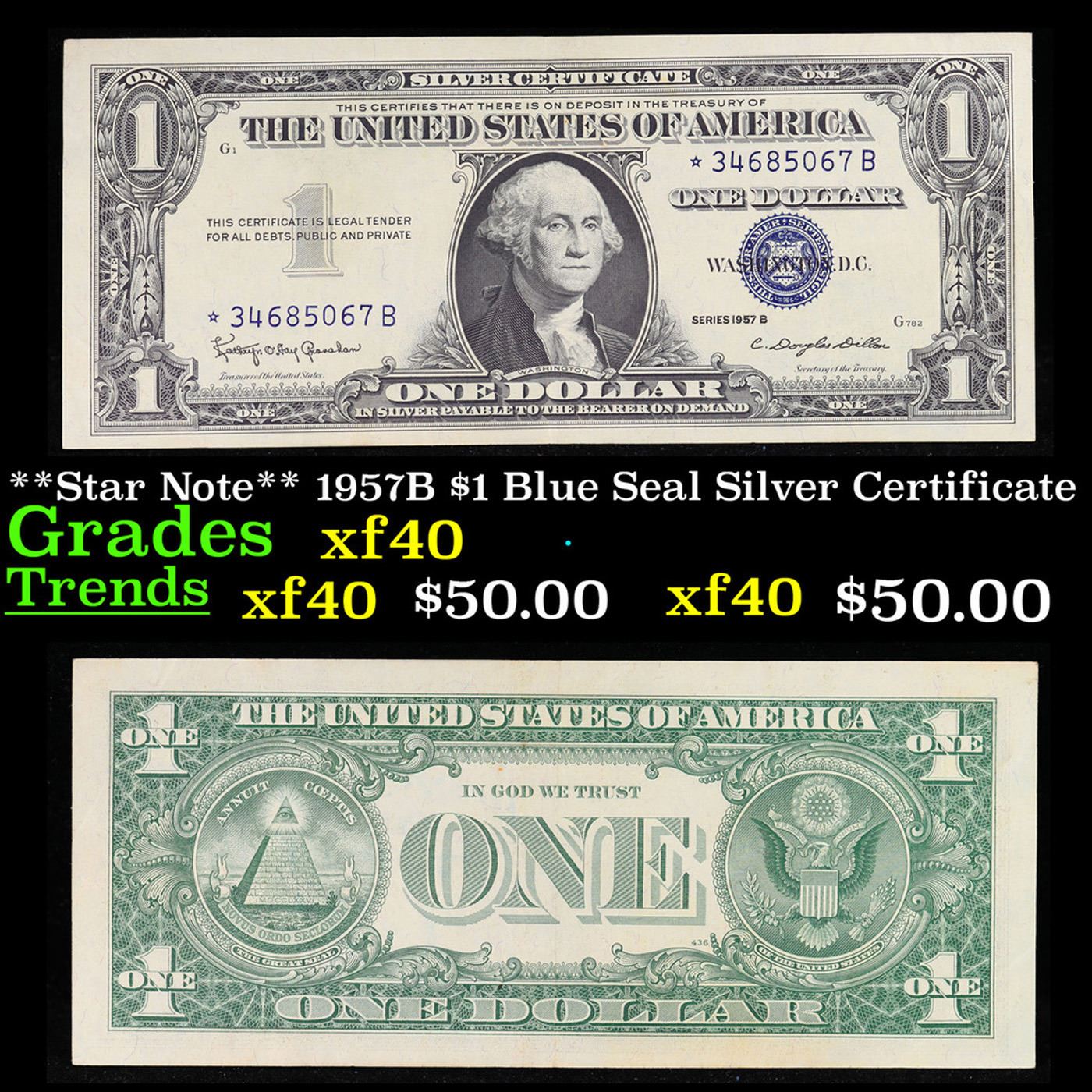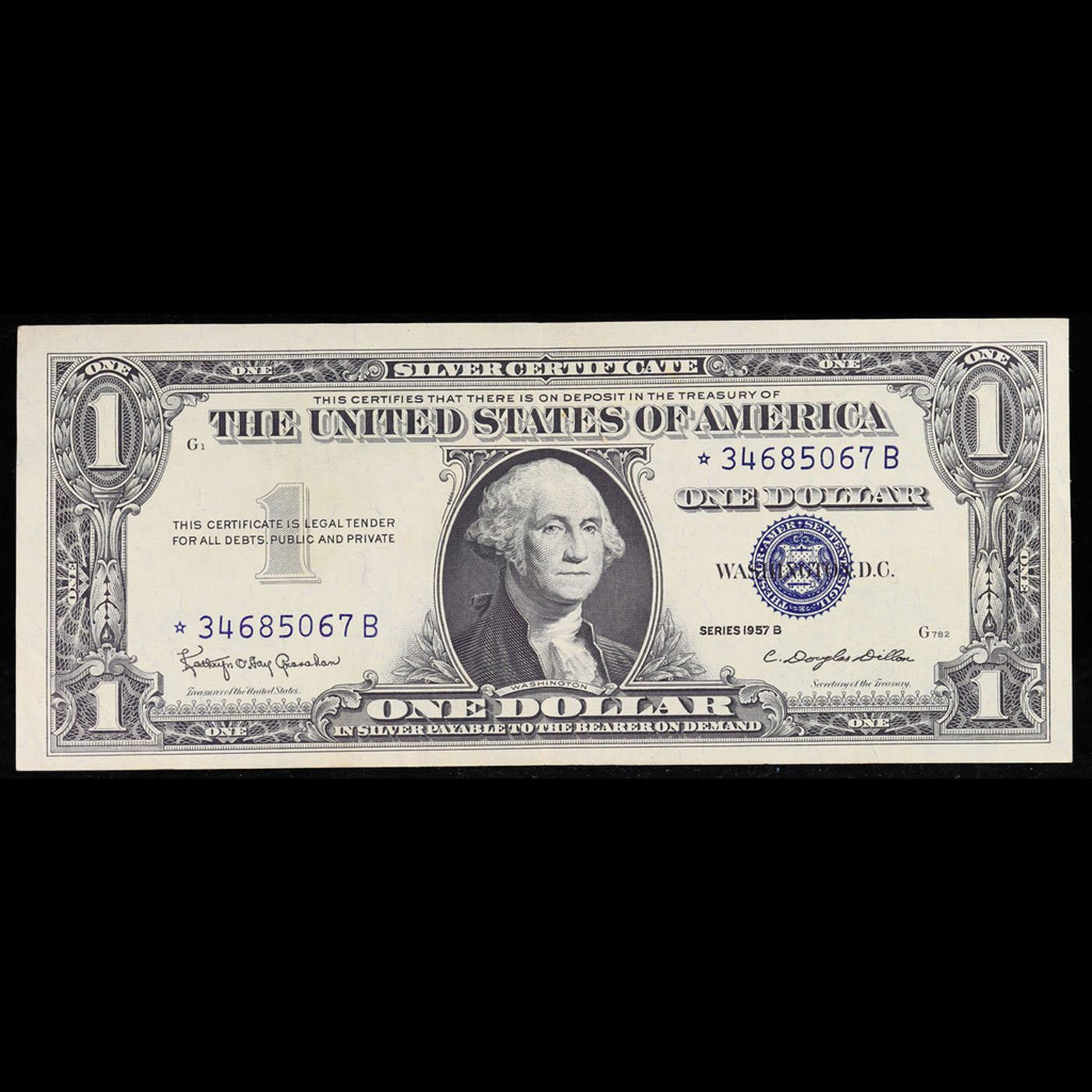 **Star Note** 1957B $1 Blue Seal Silver Certificate Grades xf. On June 4th 1963, President Kennedy issued Executive Order 11110, ordering that silver certificates be phased out. No one knew it would be his last executive order, and no one knew that it would make these 1957-B Silver Certificates sought-after collectibles today. His order caused folks to take notice and save a small number of these 1957-B $1 Silver Certificates-they were only 14% of the total 1957 Silver Certs printed. These silver certificates feature George Washington, a blue seal, and the following wording: “Silver Certificate This certifies that there is on deposit in the treasury of The United States of America One Dollar In silver payable on demand”