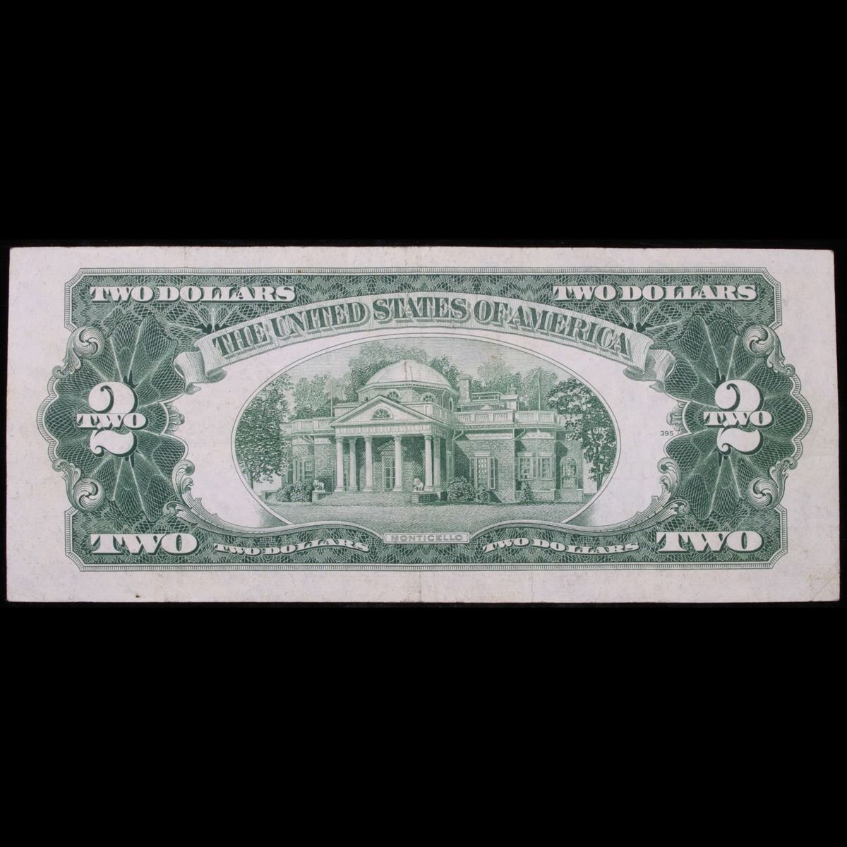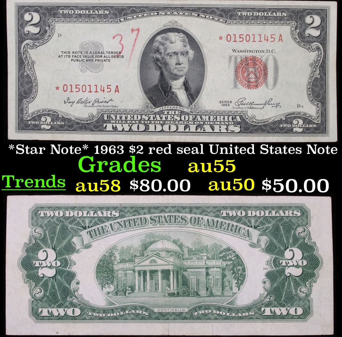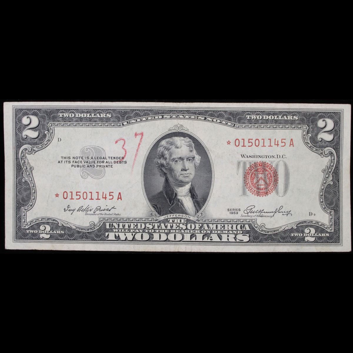 *Star Note* 1963 $2 red seal United States Note Grades. 1953 red print two dollar bills can be broken up into four different types by signature combination: 1953 – Ivy Baker Priest (Treasurer of The United States) and G.M. Humphrey (Secretary of the Treasury), 1953A – Ivy Baker Priest and Robert B Anderson, 1953B – Elizabeth Rudel Smith and C. Douglas Dillon, 1953C – Kathryn O’Hay Granahan and C. Douglas Dillon. Red seal two dollar bills from 1953 are sometimes encountered with a star at the beginning of the serial number. 1953 two dollar bills feature Thomas Jefferson as the central figure. The back of the bill shows Monticello. These were printed in Washington DC and circulated across the country. They have red overprints and a red seal on the right hand side of the bill. You can find the following phrases on the bill, “Two Dollars, United States Note, The United States of America will pay to the bearer on demand Two Dollars”, “This note is a legal tender at its face value for all debts public and private”. When notes are discovered that have been printed incorrectly (such as having the serial numbers upside down, etc.) the misprinted "error notes" are replaced with star notes because no two bills within a certain series can be produced with the same serial number. They are used to maintain a correct count of notes in a serial number run. By their nature, star notes are more scarce than notes with standard serial numbers and as such are widely collected by numismatists. Some of the highest prices paid for modern (post-1928) U.S. banknotes have been for star notes.