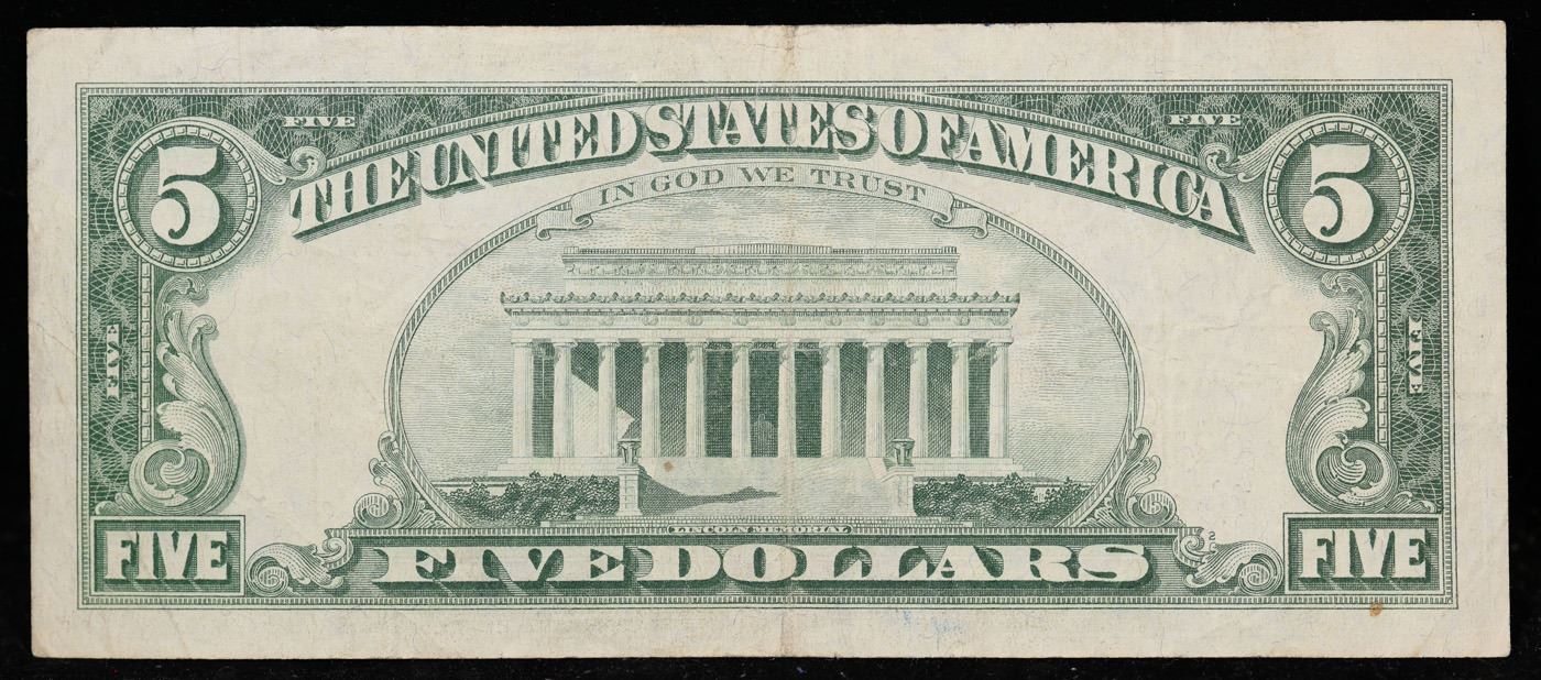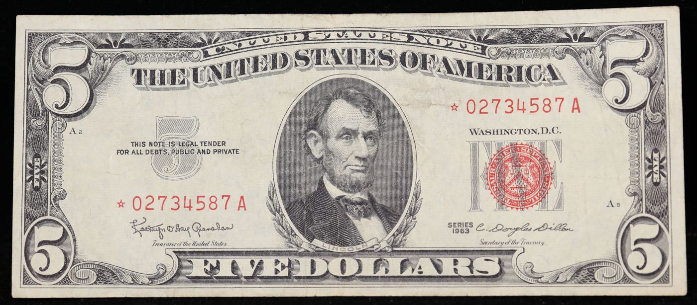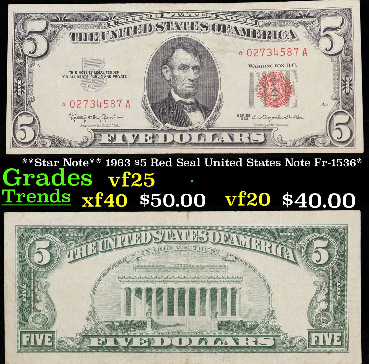 **Star Note** 1963 $5 Red Seal United States Note Fr-1536* Grades vf+.