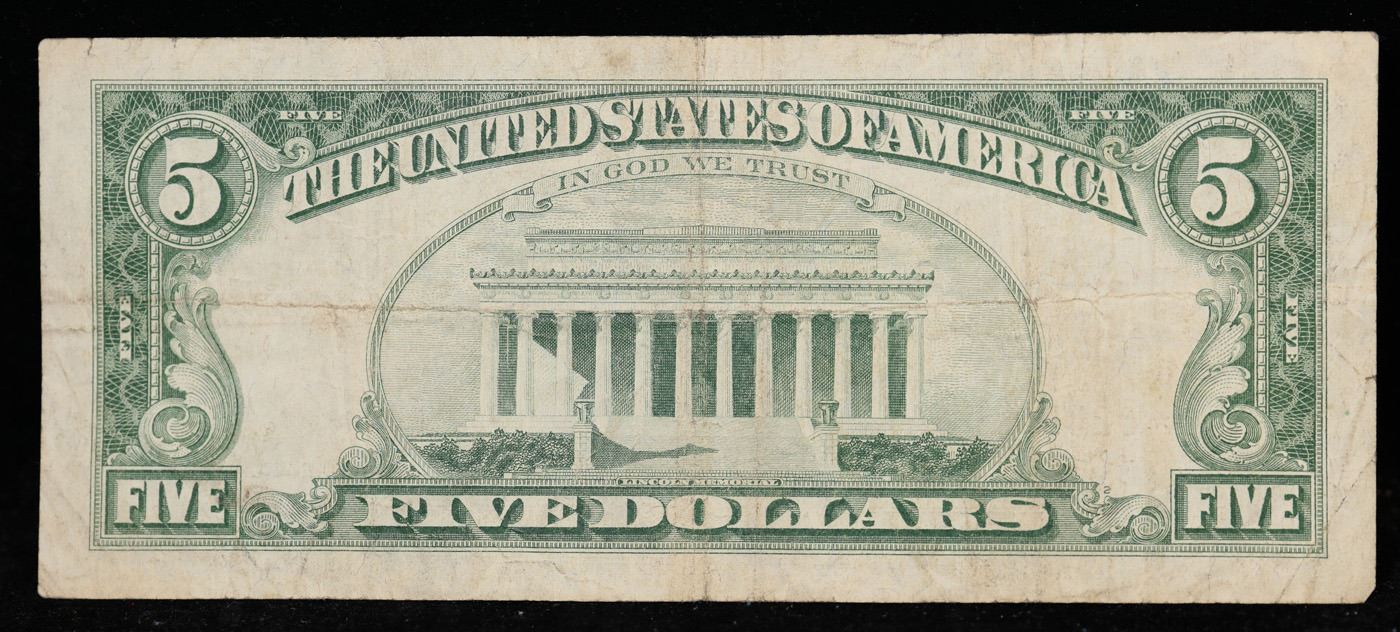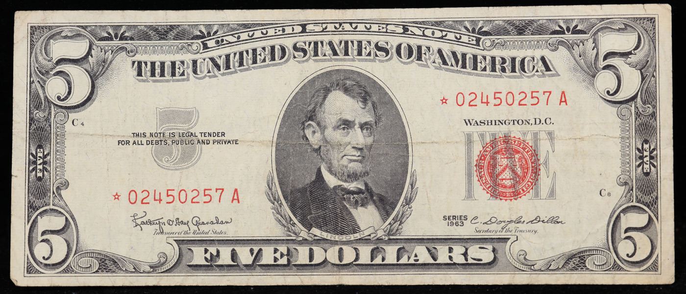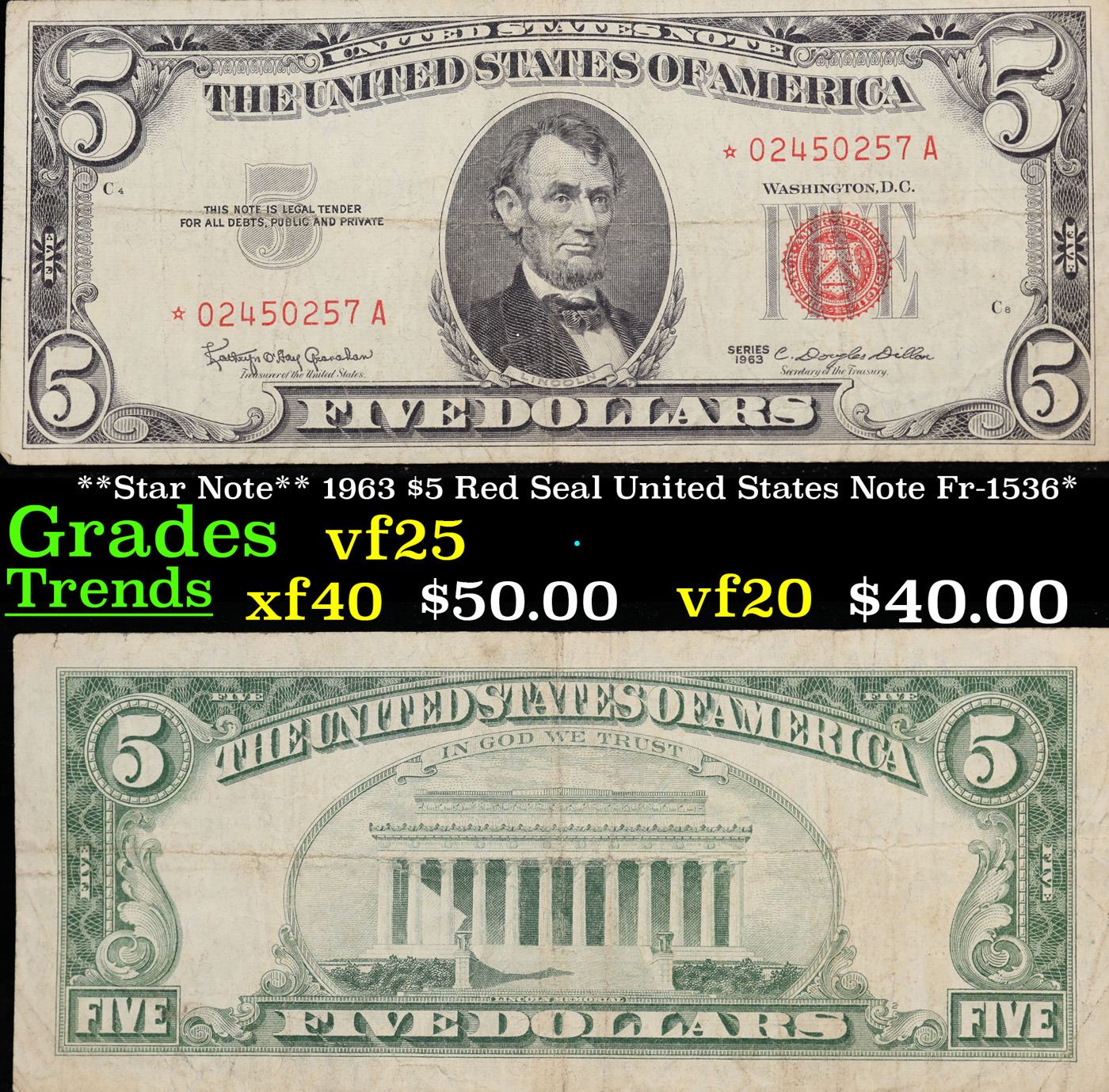 **Star Note** 1963 $5 Red Seal United States Note Fr-1536* Grades vf+.