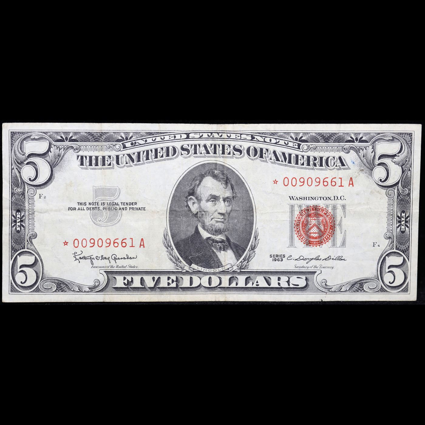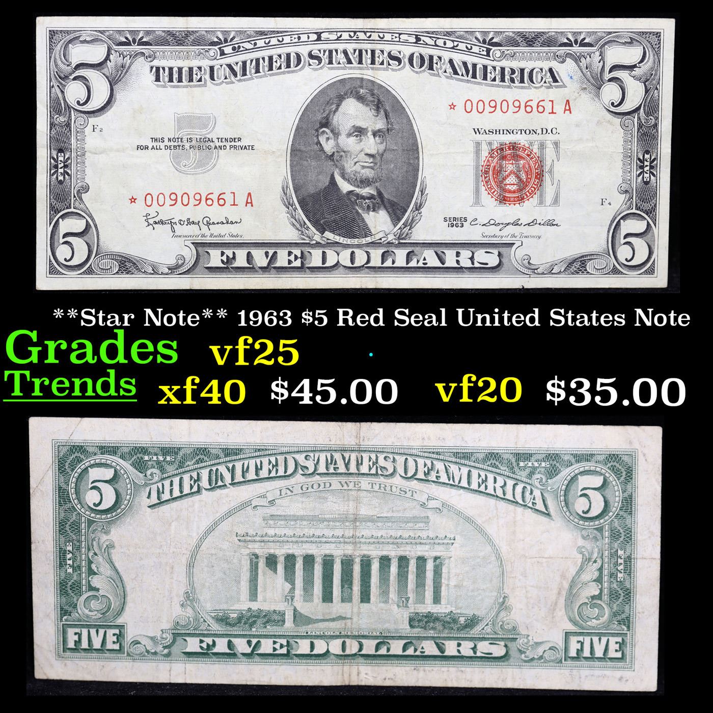 **Star Note** 1963 $5 Red Seal United States Note Grades vf+.