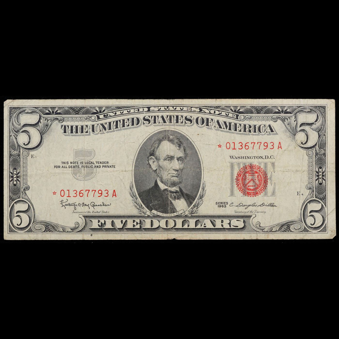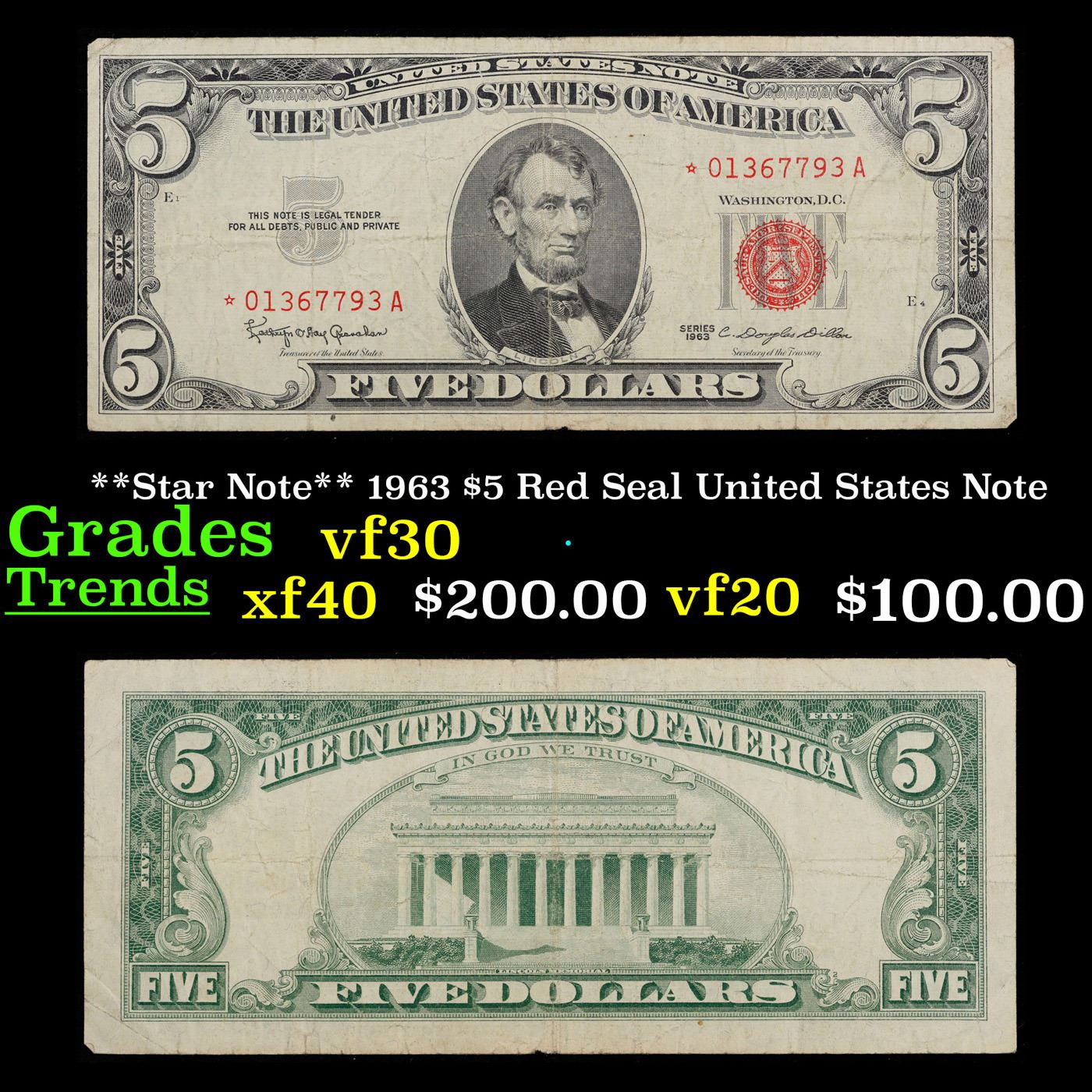 **Star Note** 1963 $5 Red Seal United States Note Grades vf++.