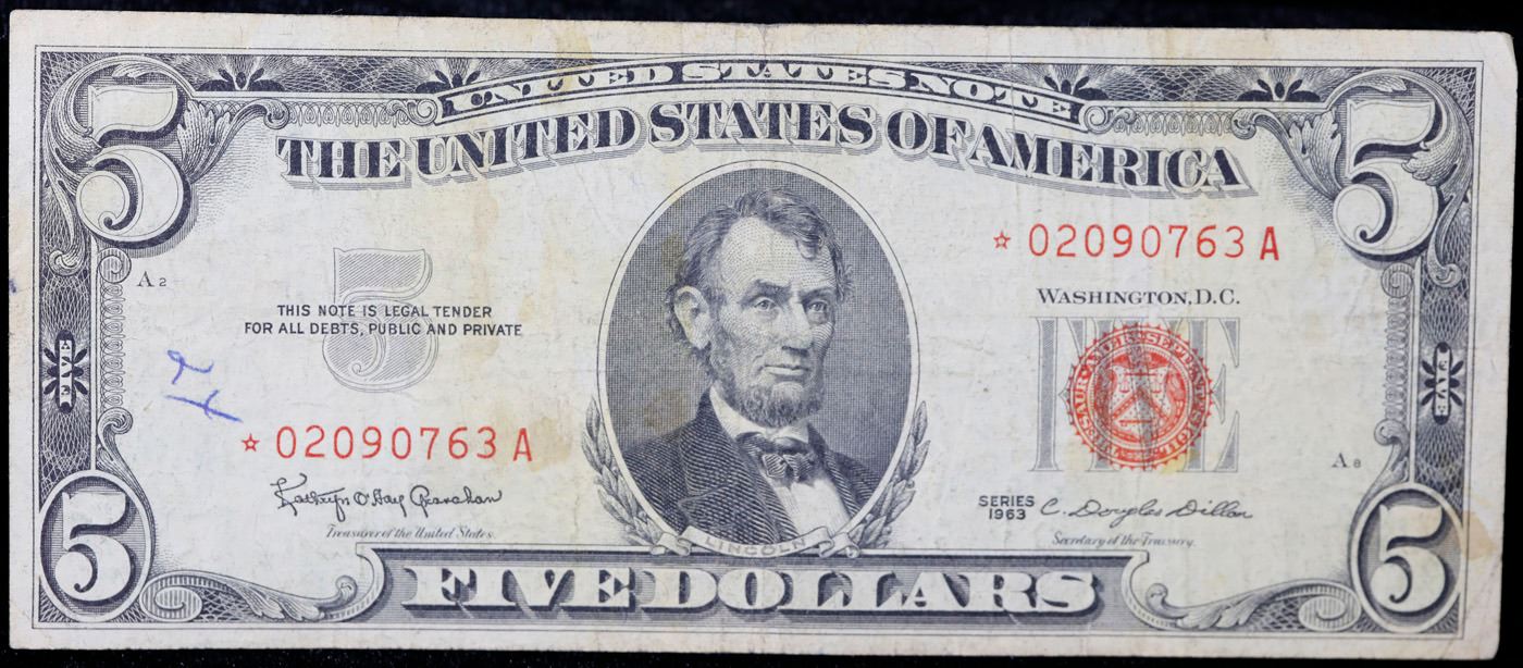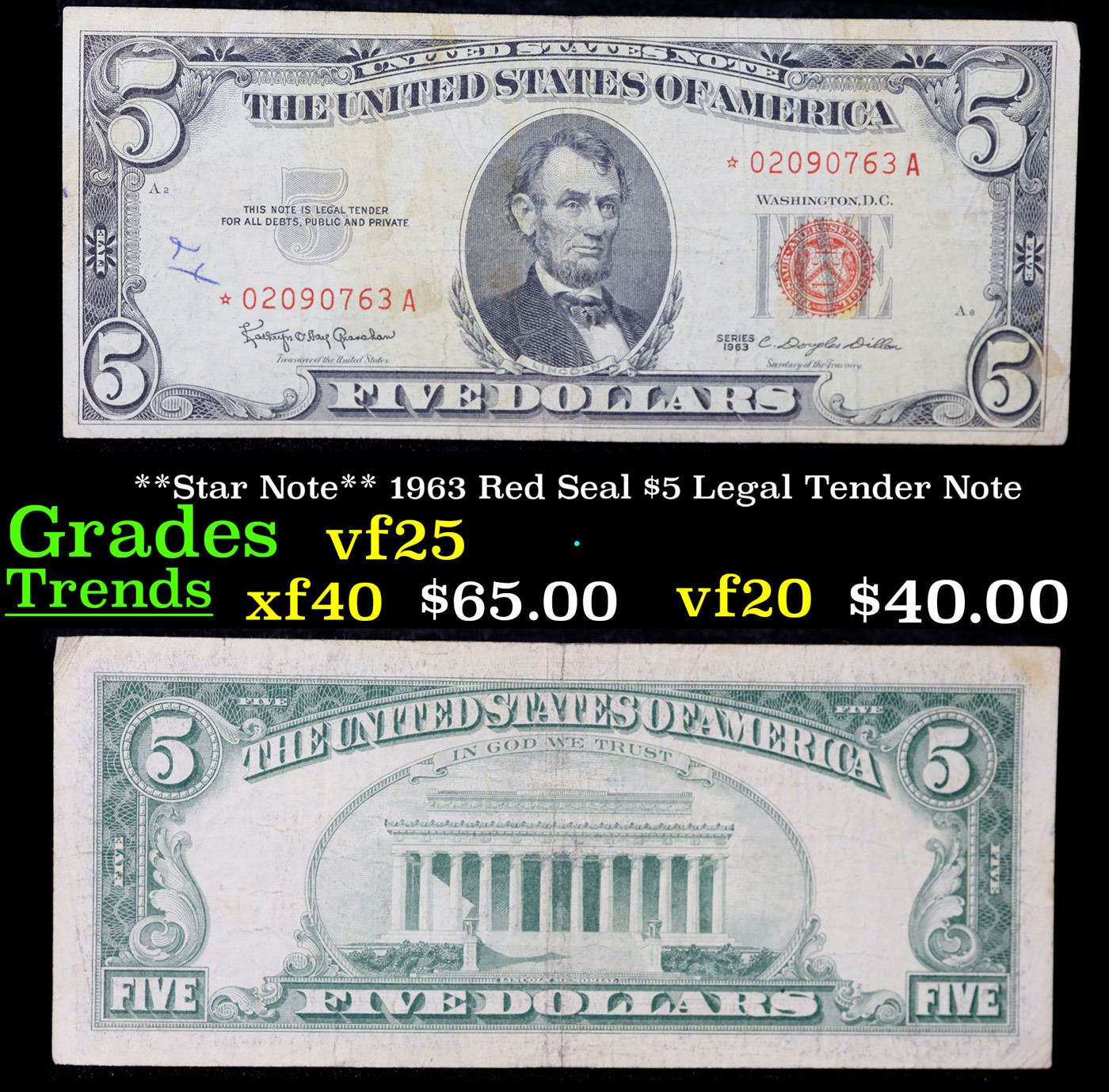 **Star Note** 1963 Red Seal $5 Legal Tender Note Grades vf+.