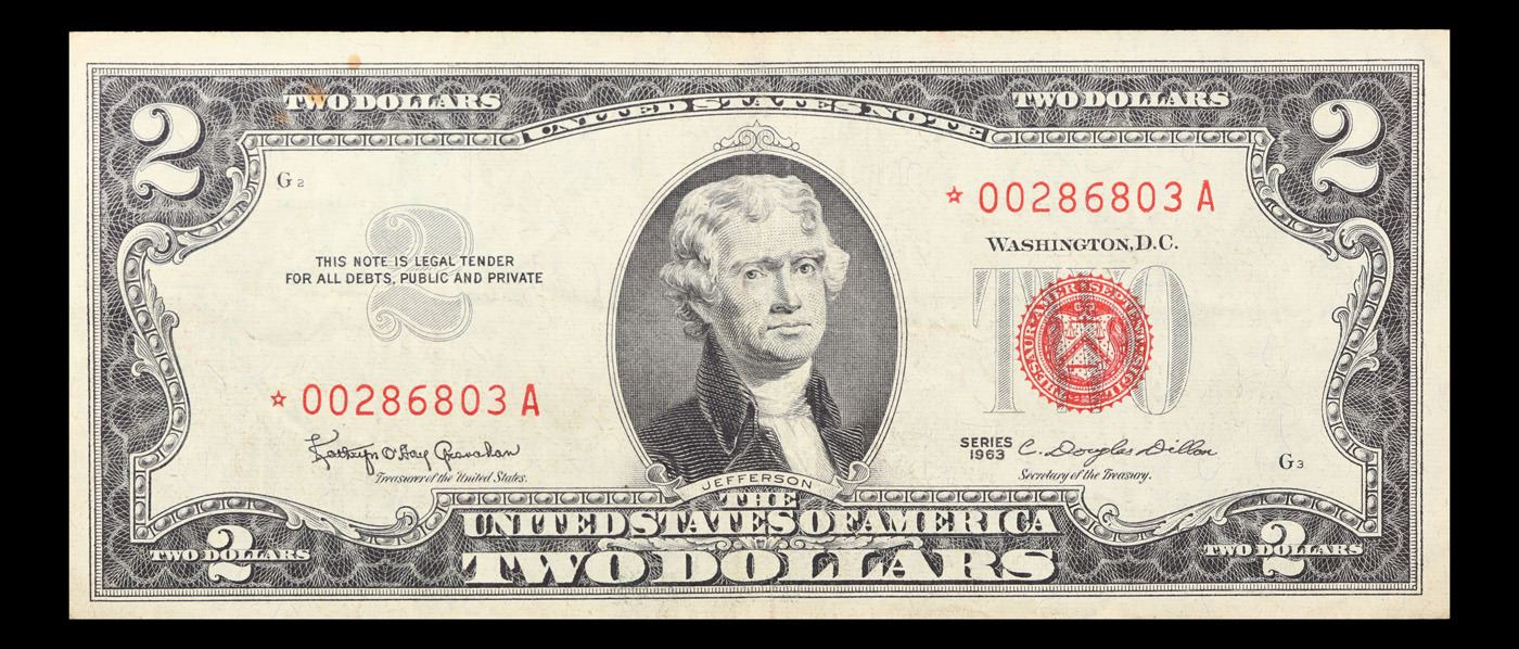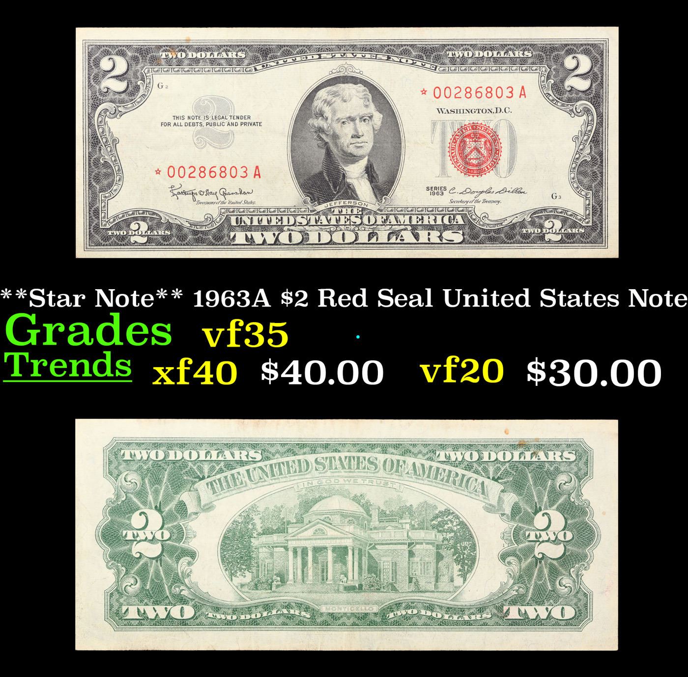 **Star Note** 1963A $2 Red Seal United States Note Grades vf++. 1963 Legal Tender (United States Note). 1963 marks the last year that red seals were printed on two dollar bills. This is also the last year that Monticello was used on the back of two dollar bills. All two dollar bills from 1963 have a red seal on the right hand side of the bank note.