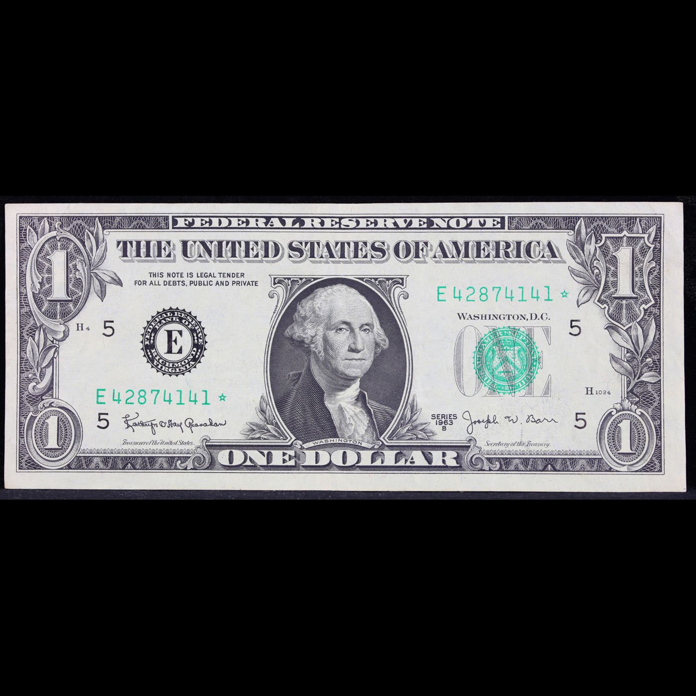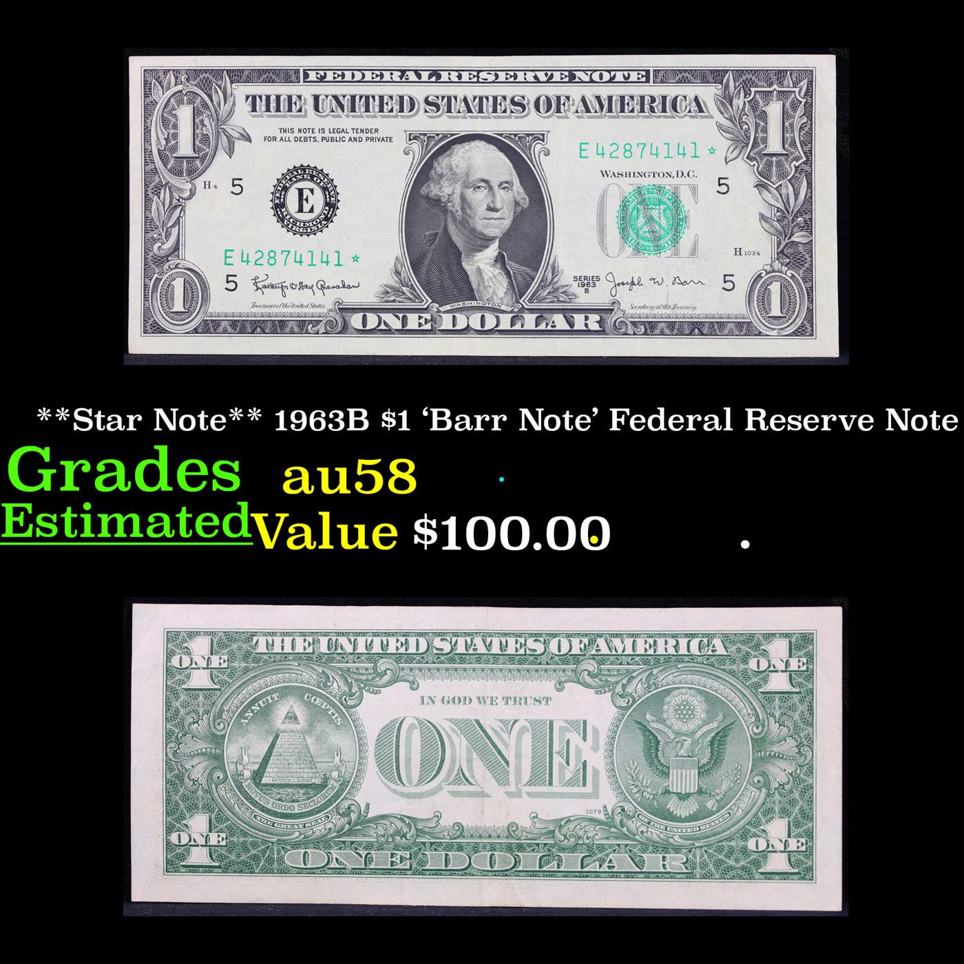 **Star Note** 1963B $1 'Barr Note' Federal Reserve Note Grades Choice AU/BU Slider. Among the most sought-after U.S. paper money of the late 1960s are the short-lived "Barr" Notes. These distinctive $1 Federal Reserve Notes bear the signature of Joseph W. Barr, who served as Secretary of the Treasury during the last 28 days of President Lyndon B. Johnson's administration. Barr was replaced when President Nixon chose a successor. Due to Barr's short term, his signature appeared only on the $1 notes of Series 1963B.