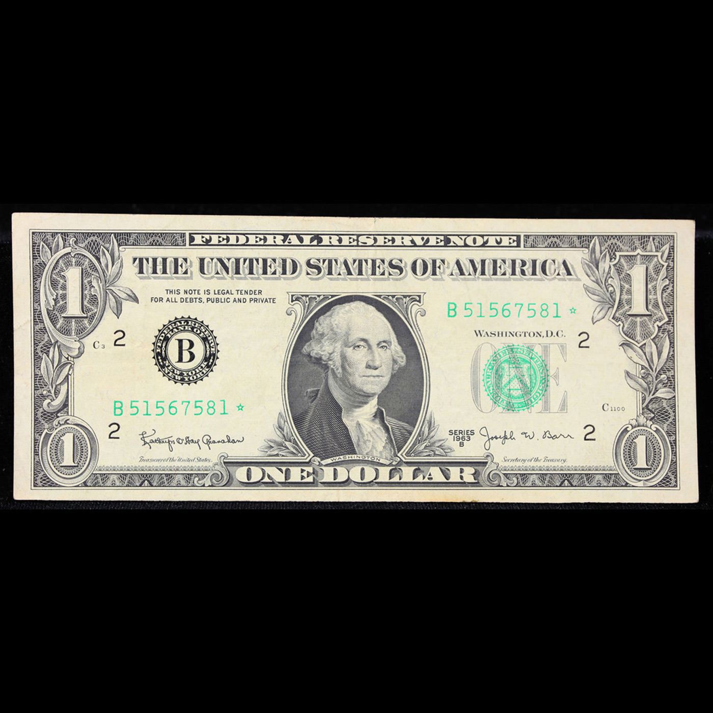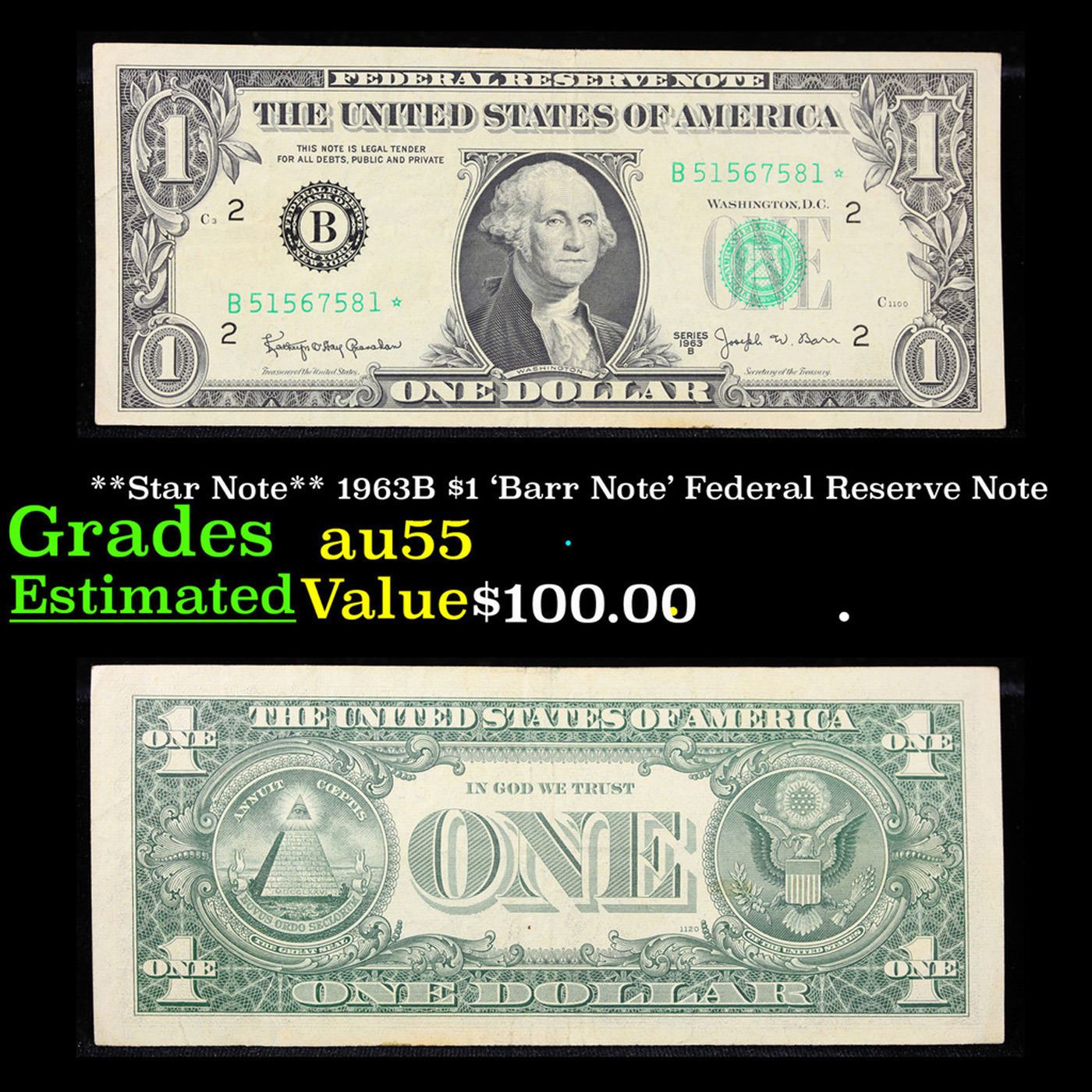 **Star Note** 1963B $1 'Barr Note' Federal Reserve Note Grades Choice AU. Among the most sought-after U.S. paper money of the late 1960s are the short-lived "Barr" Notes. These distinctive $1 Federal Reserve Notes bear the signature of Joseph W. Barr, who served as Secretary of the Treasury during the last 28 days of President Lyndon B. Johnson's administration. Barr was replaced when President Nixon chose a successor. Due to Barr's short term, his signature appeared only on the $1 notes of Series 1963B.