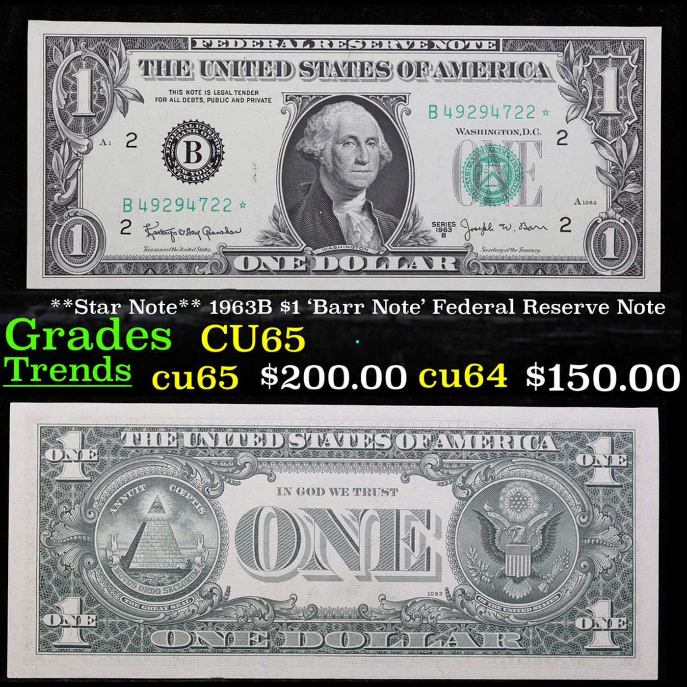 **Star Note** 1963B $1 'Barr Note' Federal Reserve Note Grades Gem CU. Among the most sought-after U.S. paper money of the late 1960s are the short-lived "Barr" Notes. These distinctive $1 Federal Reserve Notes bear the signature of Joseph W. Barr, who served as Secretary of the Treasury during the last 28 days of President Lyndon B. Johnson's administration. Barr was replaced when President Nixon chose a successor. Due to Barr's short term, his signature appeared only on the $1 notes of Series 1963B.