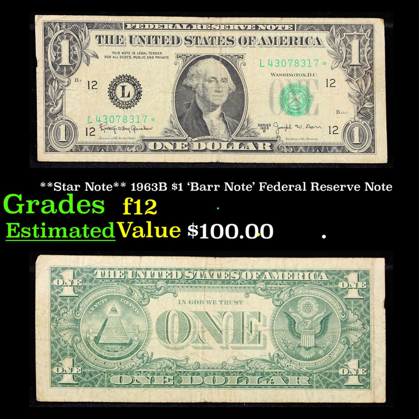 **Star Note** 1963B $1 'Barr Note' Federal Reserve Note Grades f, fine. Among the most sought-after U.S. paper money of the late 1960s are the short-lived "Barr" Notes. These distinctive $1 Federal Reserve Notes bear the signature of Joseph W. Barr, who served as Secretary of the Treasury during the last 28 days of President Lyndon B. Johnson's administration. Barr was replaced when President Nixon chose a successor. Due to Barr's short term, his signature appeared only on the $1 notes of Series 1963B.
