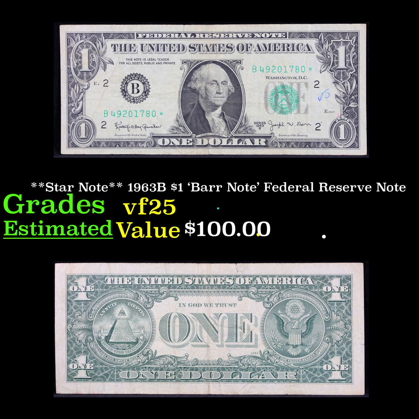**Star Note** 1963B $1 'Barr Note' Federal Reserve Note Grades vf+. Among the most sought-after U.S. paper money of the late 1960s are the short-lived "Barr" Notes. These distinctive $1 Federal Reserve Notes bear the signature of Joseph W. Barr, who served as Secretary of the Treasury during the last 28 days of President Lyndon B. Johnson's administration. Barr was replaced when President Nixon chose a successor. Due to Barr's short term, his signature appeared only on the $1 notes of Series 1963B.
