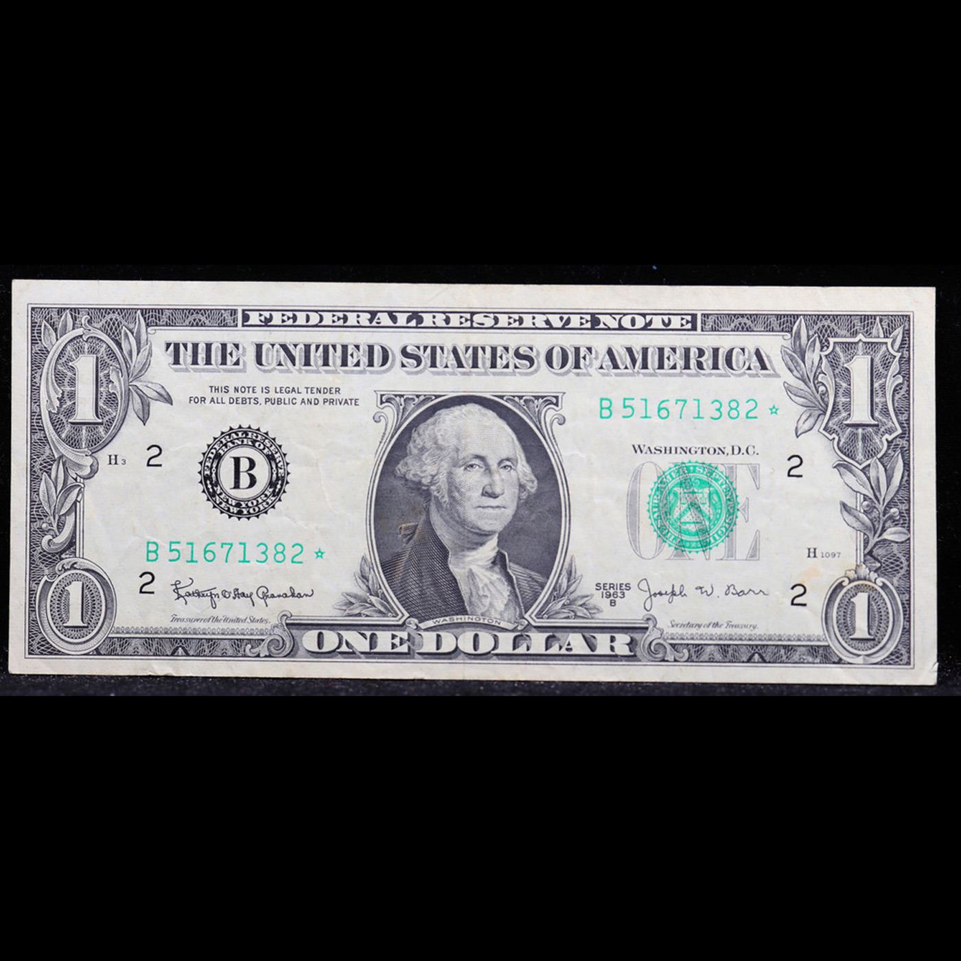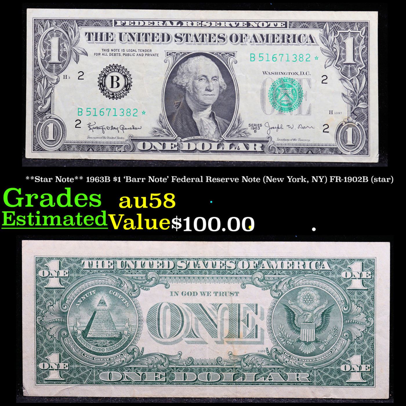 **Star Note** 1963B $1 'Barr Note' Federal Reserve Note (New York, NY) FR-1902B (star) Grades Choice AU/BU Slider. Among the most sought-after U.S. paper money of the late 1960s are the short-lived "Barr" Notes. These distinctive $1 Federal Reserve Notes bear the signature of Joseph W. Barr, who served as Secretary of the Treasury during the last 28 days of President Lyndon B. Johnson's administration. Barr was replaced when President Nixon chose a successor. Due to Barr's short term, his signature appeared only on the $1 notes of Series 1963B.