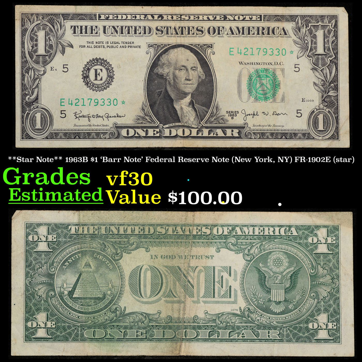 **Star Note** 1963B $1 'Barr Note' Federal Reserve Note (New York, NY) FR-1902E (star) Grades vf++