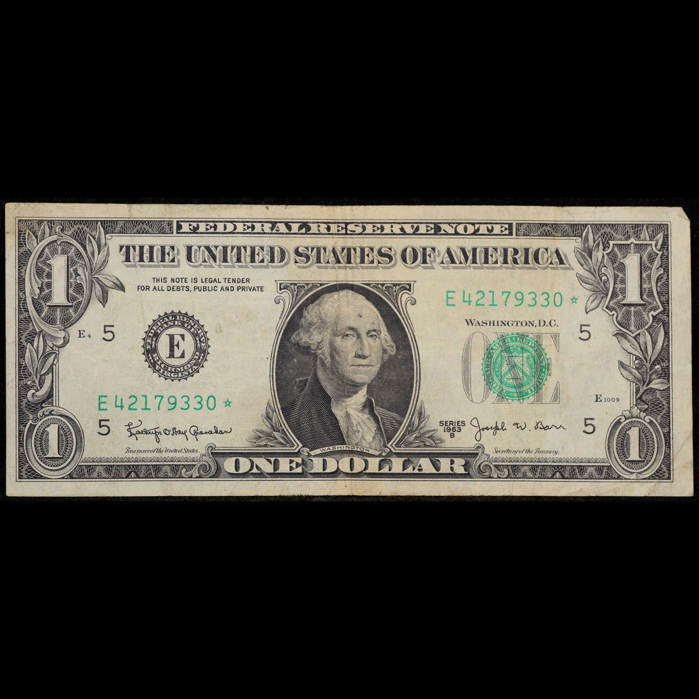 **Star Note** 1963B $1 'Barr Note' Federal Reserve Note (New York, NY) FR-1902E (star) Grades vf++. Among the most sought-after U.S. paper money of the late 1960s are the short-lived "Barr" Notes. These distinctive $1 Federal Reserve Notes bear the signature of Joseph W. Barr, who served as Secretary of the Treasury during the last 28 days of President Lyndon B. Johnson's administration. Barr was replaced when President Nixon chose a successor. Due to Barr's short term, his signature appeared only on the $1 notes of Series 1963B.