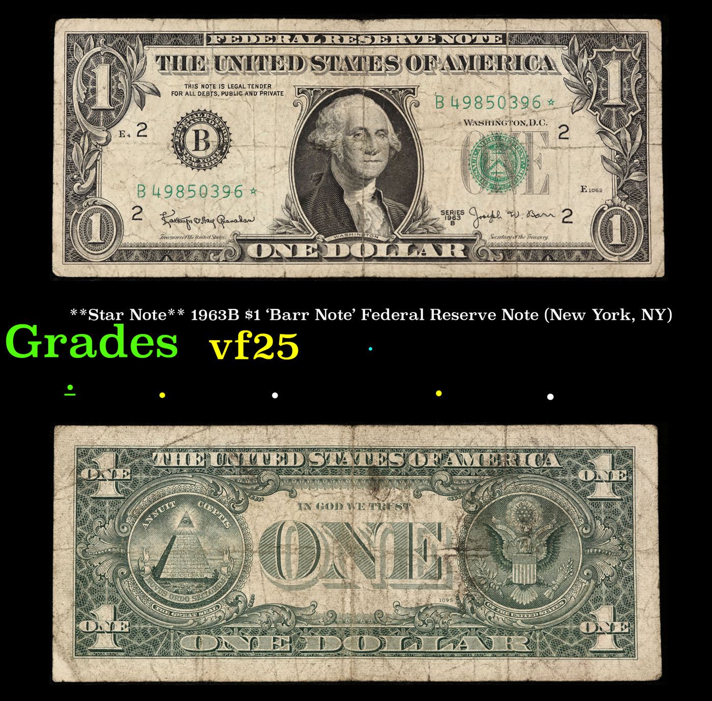 **Star Note** 1963B $1 'Barr Note' Federal Reserve Note (New York, NY) Grades vf+