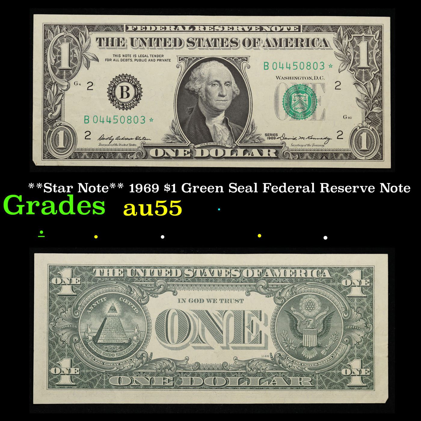 **Star Note** 1969 $1 Green Seal Federal Reserve Note Grades Choice AU.