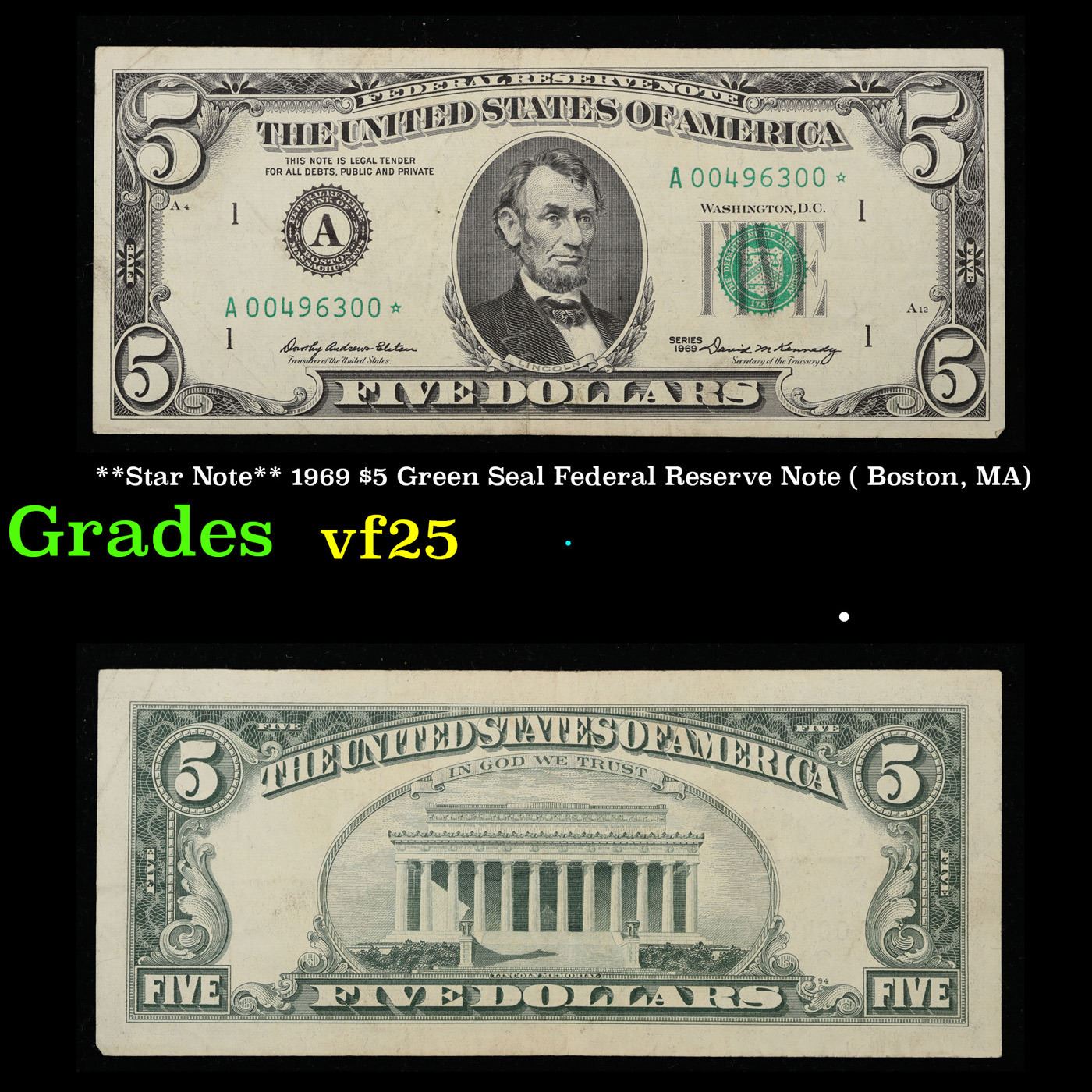 **Star Note** 1969 $5 Green Seal Federal Reserve Note ( Boston, MA) Grades vf+