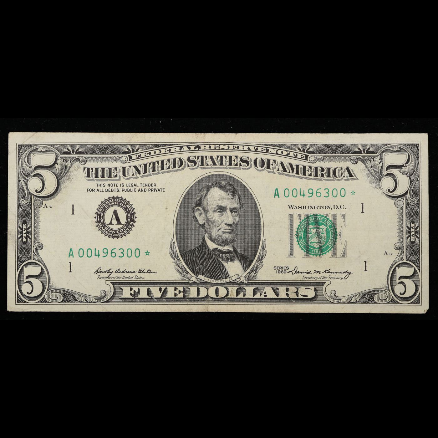 **Star Note** 1969 $5 Green Seal Federal Reserve Note ( Boston, MA) Grades vf+.