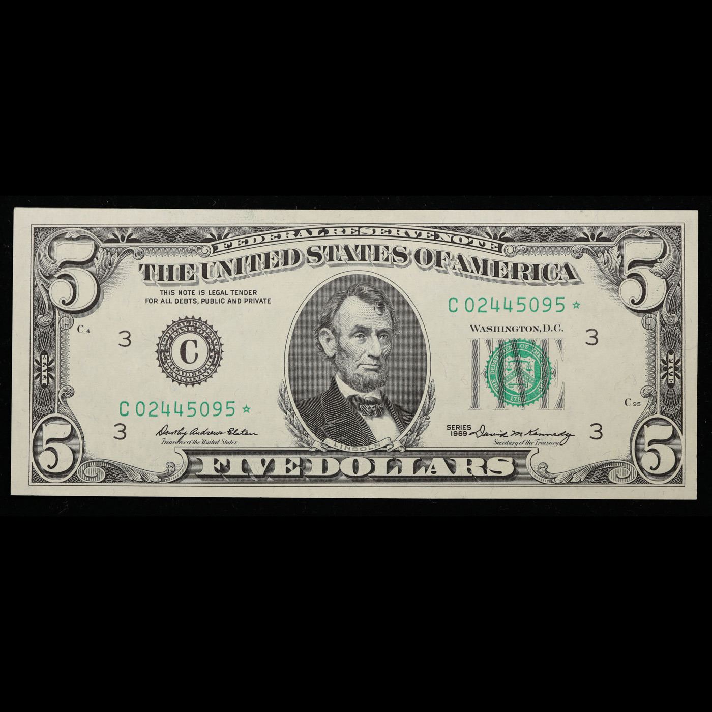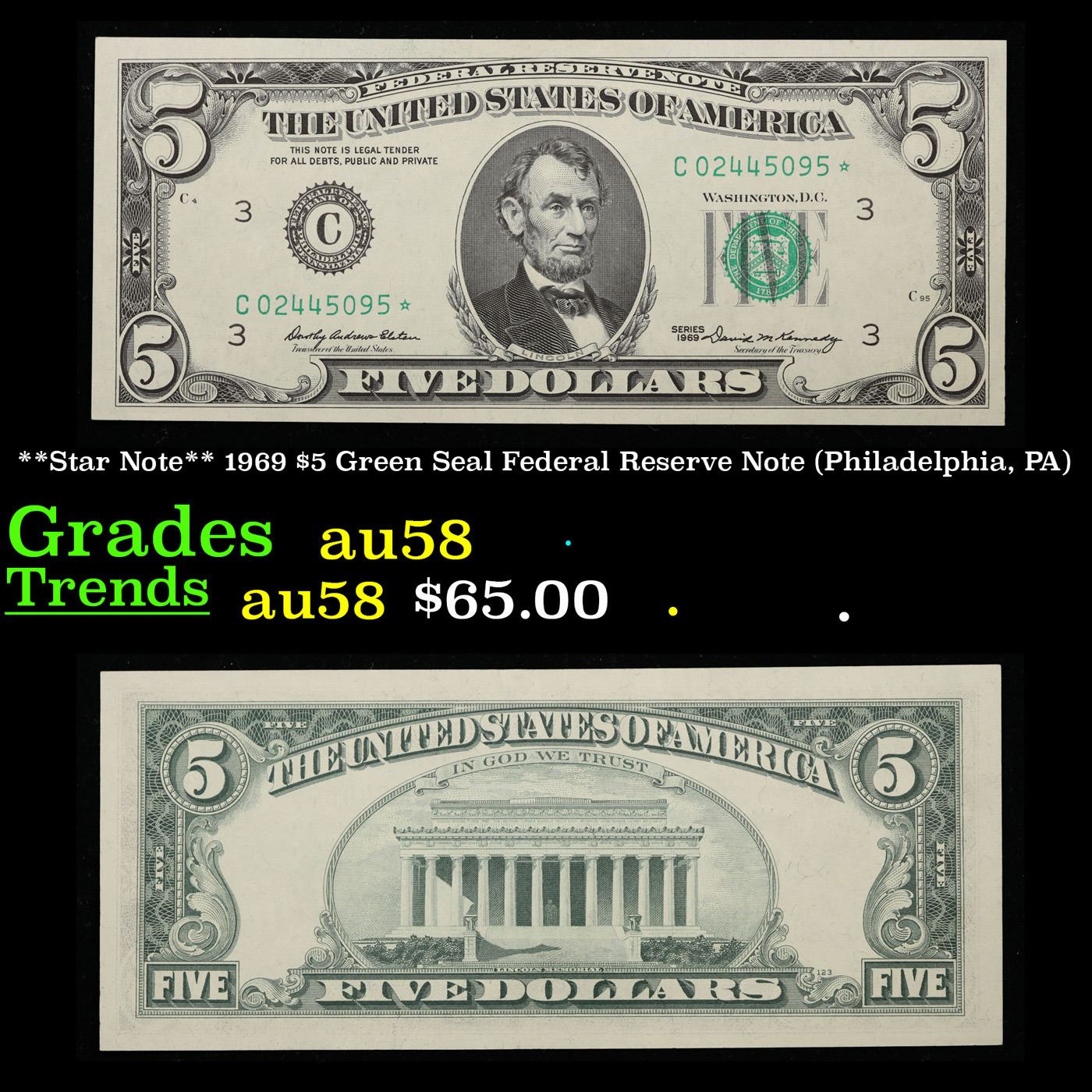 **Star Note** 1969 $5 Green Seal Federal Reserve Note (Philadelphia, PA) Grades Choice AU/BU Slider