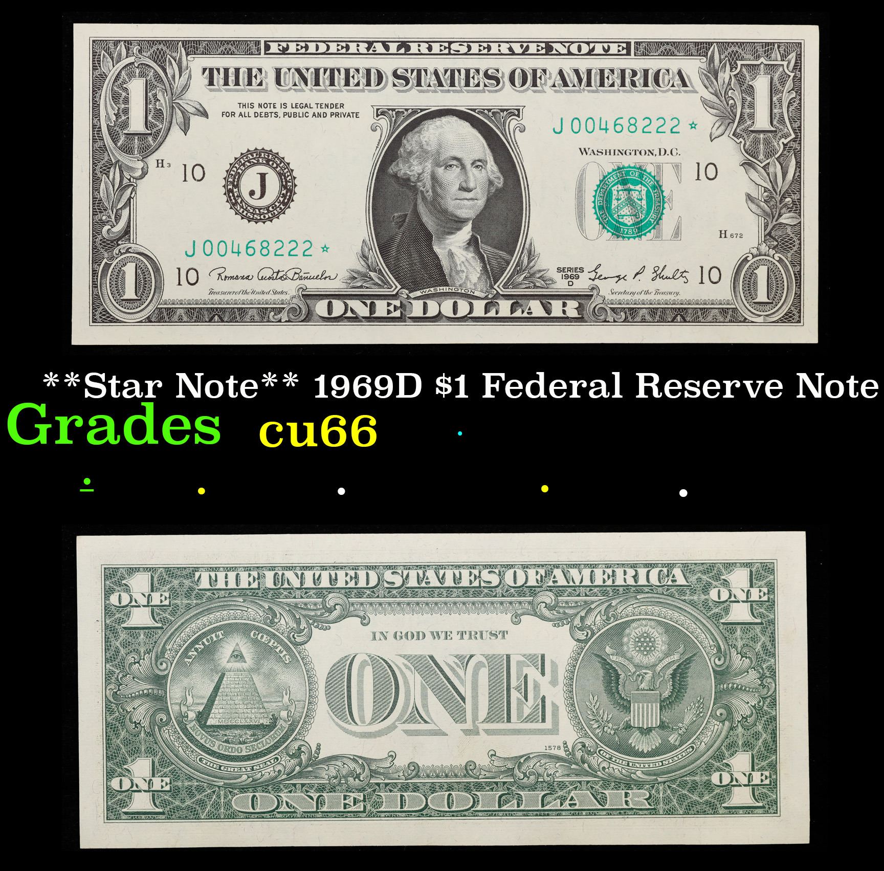**Star Note** 1969D $1 Federal Reserve Note Grades Gem+ CU.