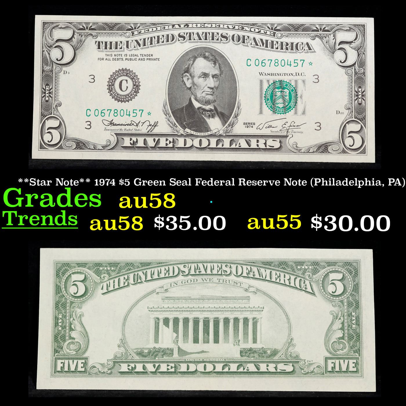 **Star Note** 1974 $5 Green Seal Federal Reserve Note (Philadelphia, PA) Grades Choice AU/BU Slider