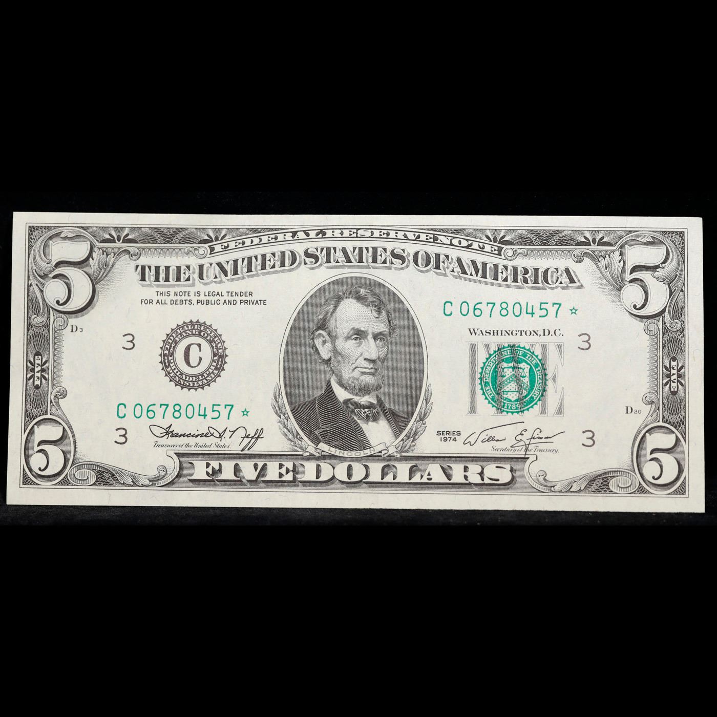 **Star Note** 1974 $5 Green Seal Federal Reserve Note (Philadelphia, PA) Grades Choice AU/BU Slider.