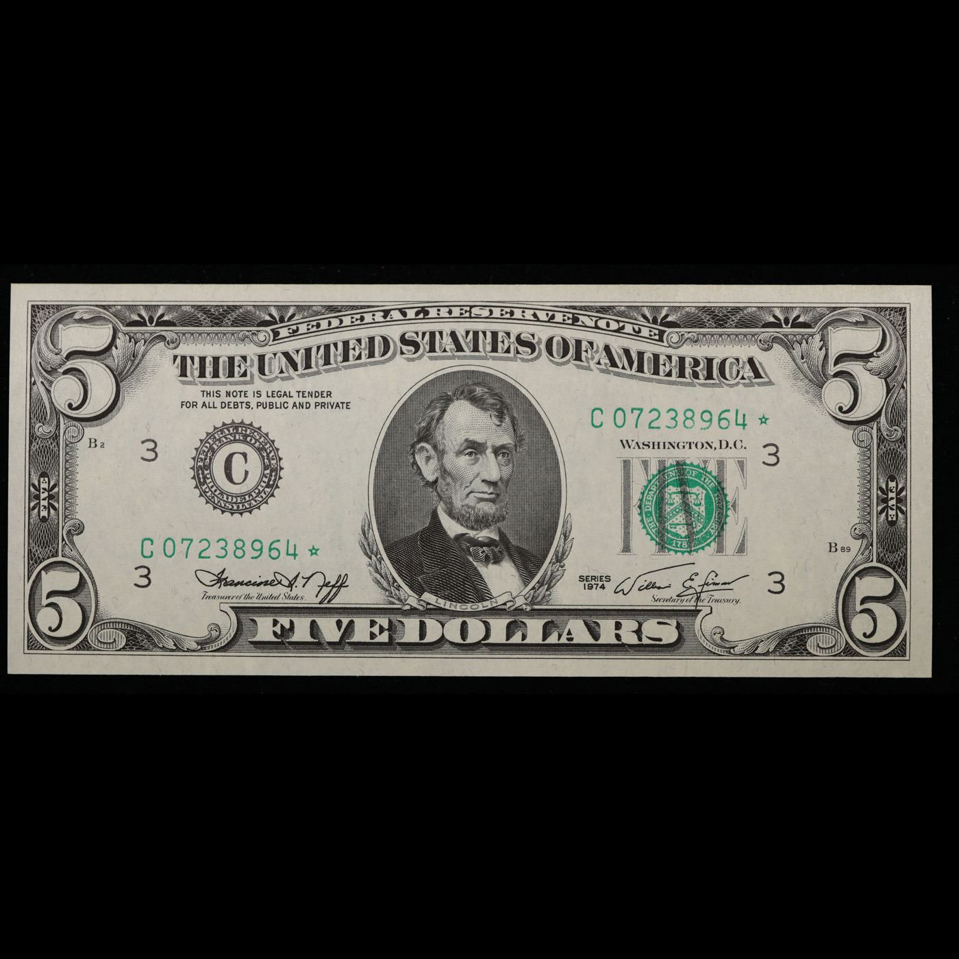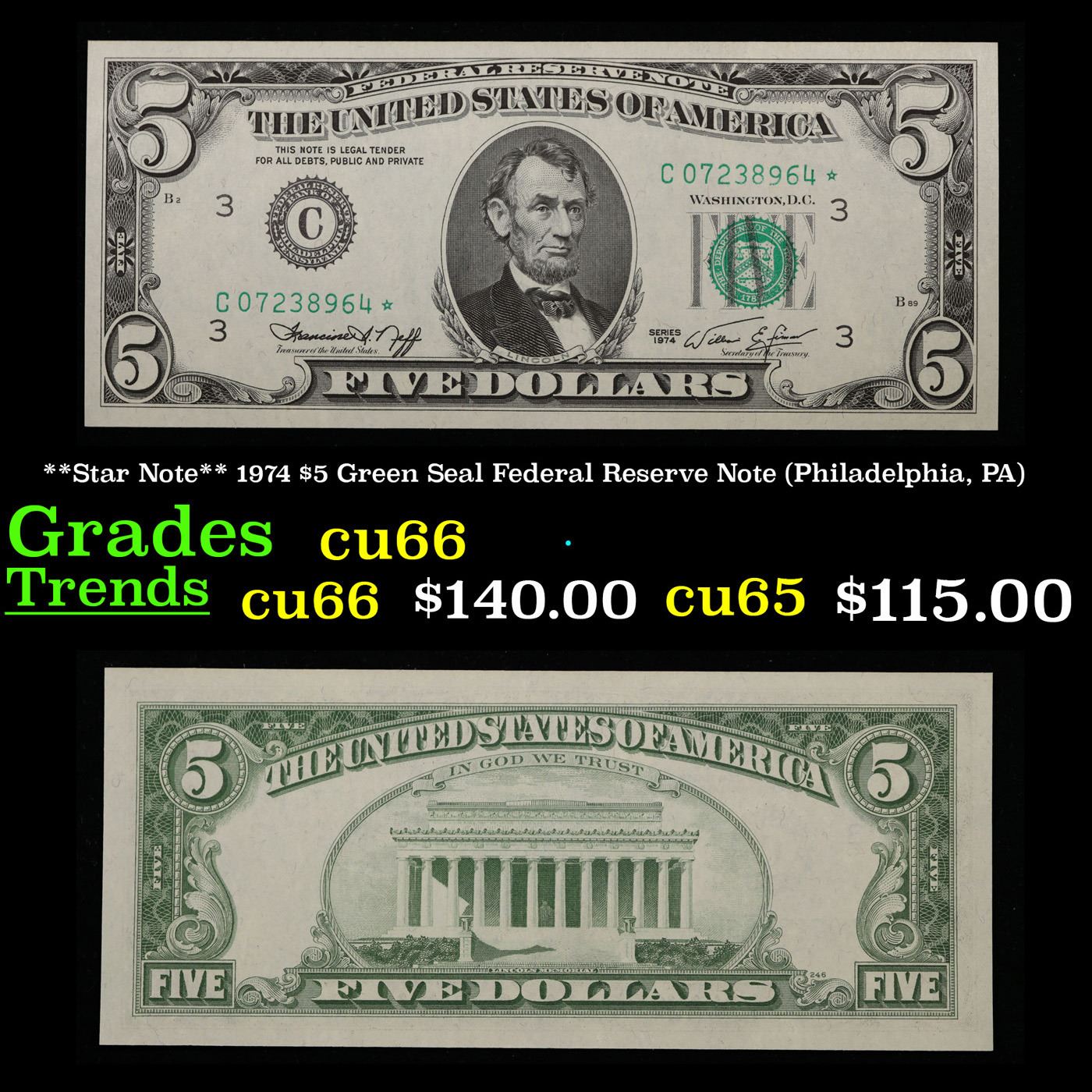 **Star Note** 1974 $5 Green Seal Federal Reserve Note (Philadelphia, PA) Grades Gem+ CU.
