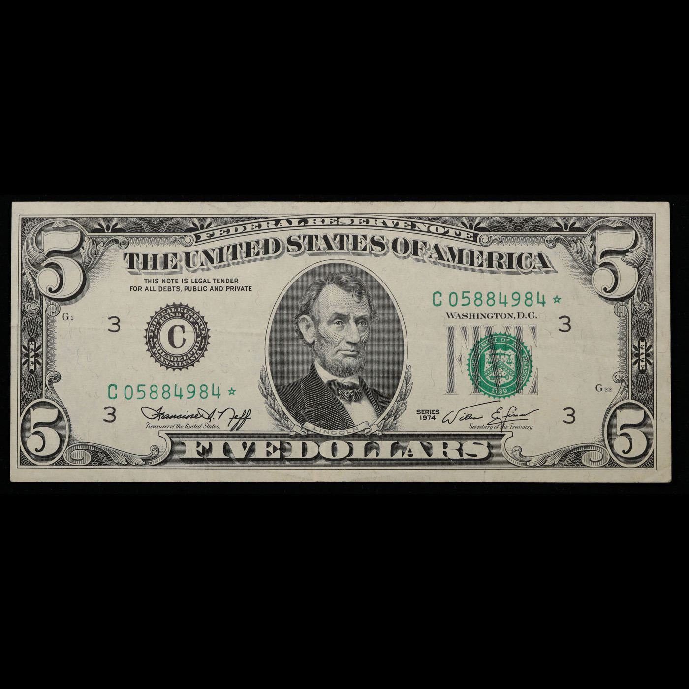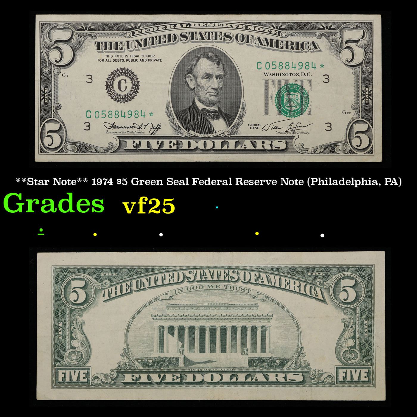 **Star Note** 1974 $5 Green Seal Federal Reserve Note (Philadelphia, PA) Grades vf+.