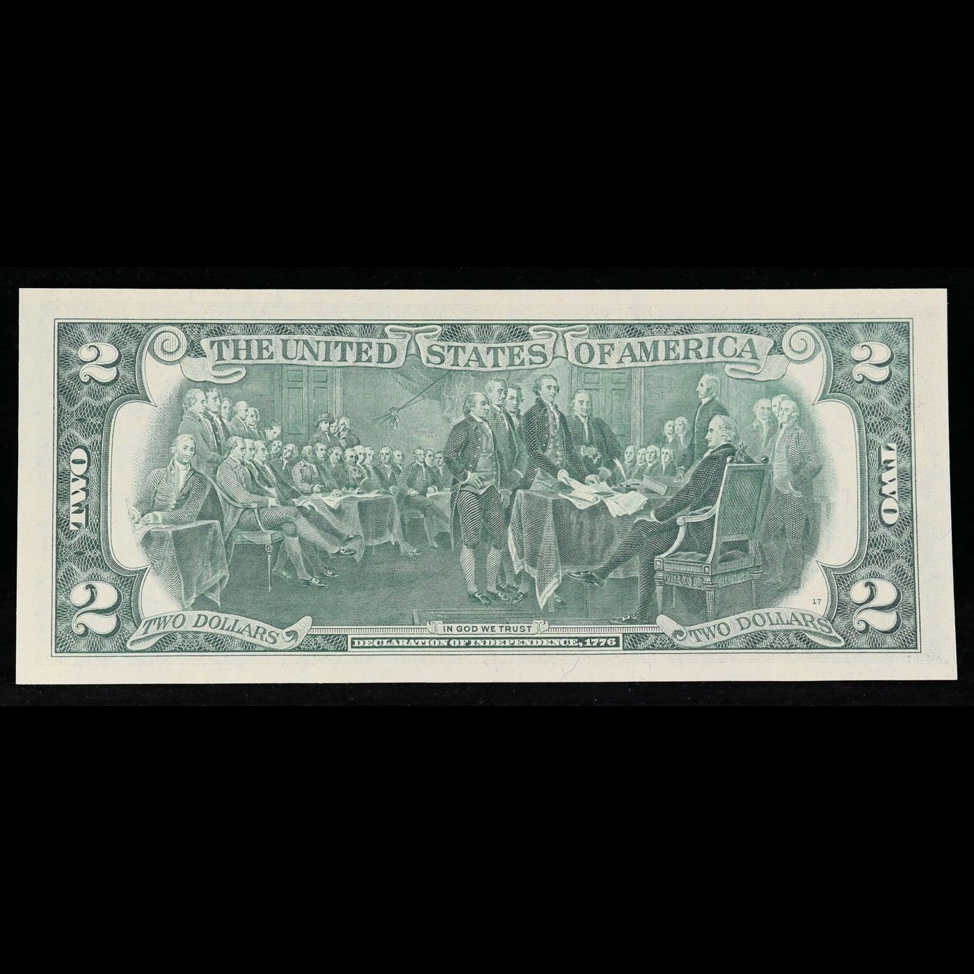 **Star Note** 1976 $2 Federal Reserve Note (New York, NY) Low Serial # Grades Choice CU. On April 13, 1976, to celebrate the bicentennial of American independence, new $2 Federal Reserve Notes were issued with backs featuring the well-known painting Signing of the Declaration of Independence. These Notes all have a 13c Stamp or 2 stamps totaling 13c hand canceled on April 13, 1976 for the first day of issue of the new $2 notes. These official first-day-of-issue Bicentennial notes will be historic additions to your collection (designs and locations of the 13¢ stamps will vary).