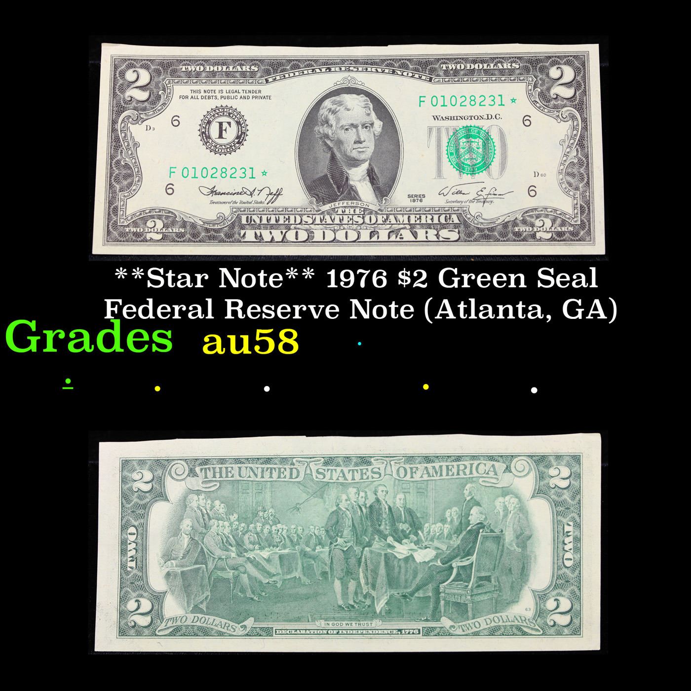 **Star Note** 1976 $2 Green Seal Federal Reserve Note (Atlanta, GA) Grades Choice AU/BU Slider.
