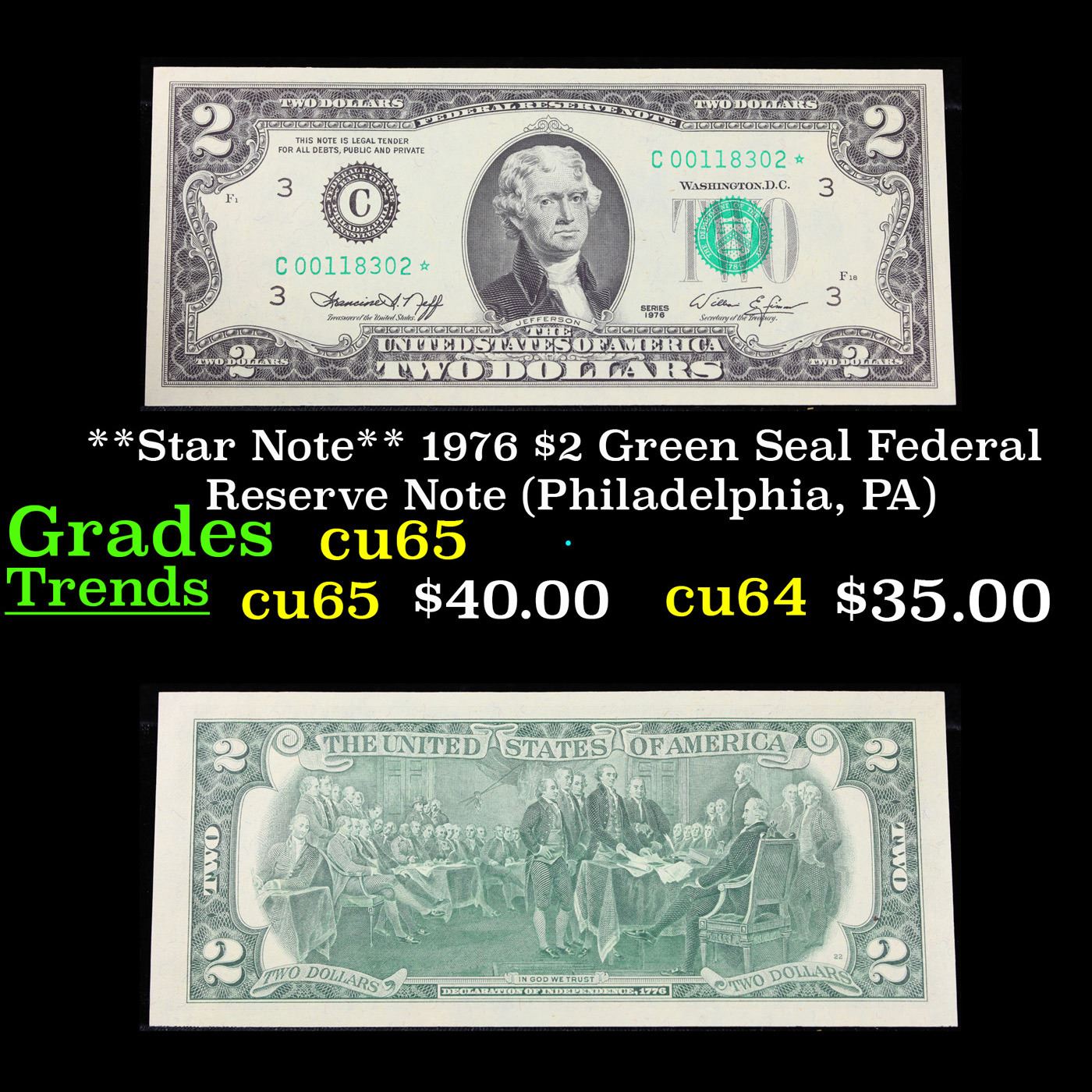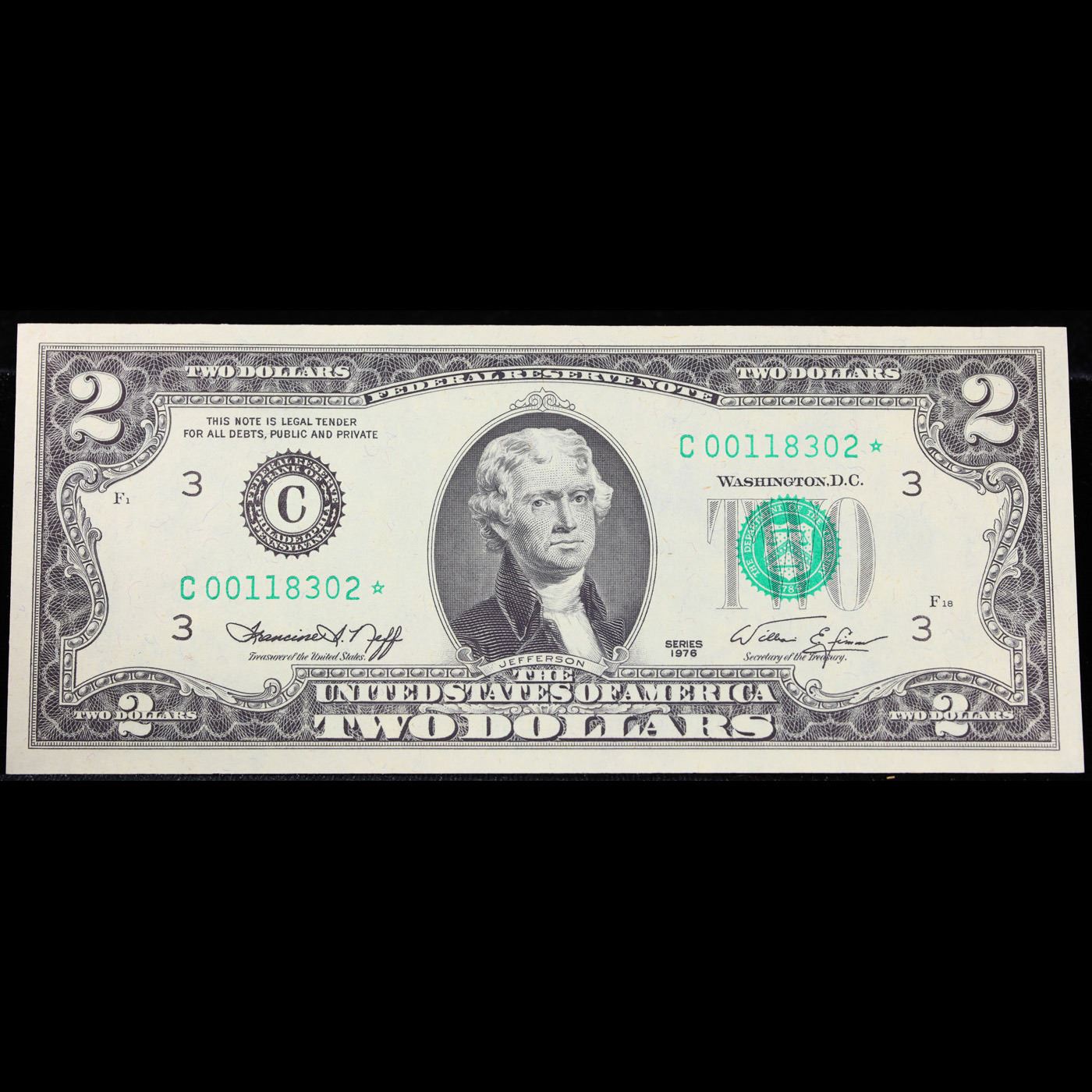 **Star Note** 1976 $2 Green Seal Federal Reserve Note (Philadelphia, PA) Grades Gem CU.
