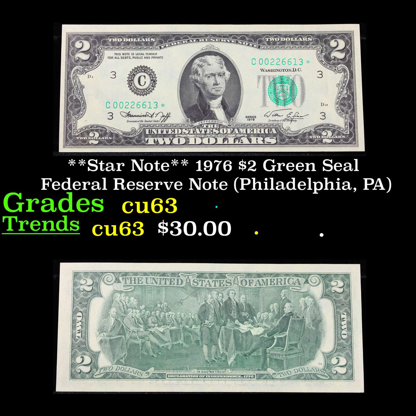 **Star Note** 1976 $2 Green Seal Federal Reserve Note (Philadelphia, PA) Grades Select CU