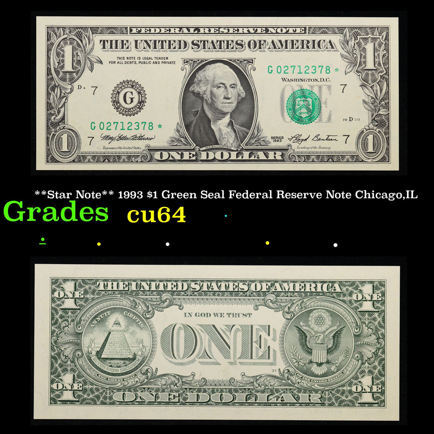 **Star Note** 1993 $1 Green Seal Federal Reserve Note Chicago,IL Grades Choice CU.