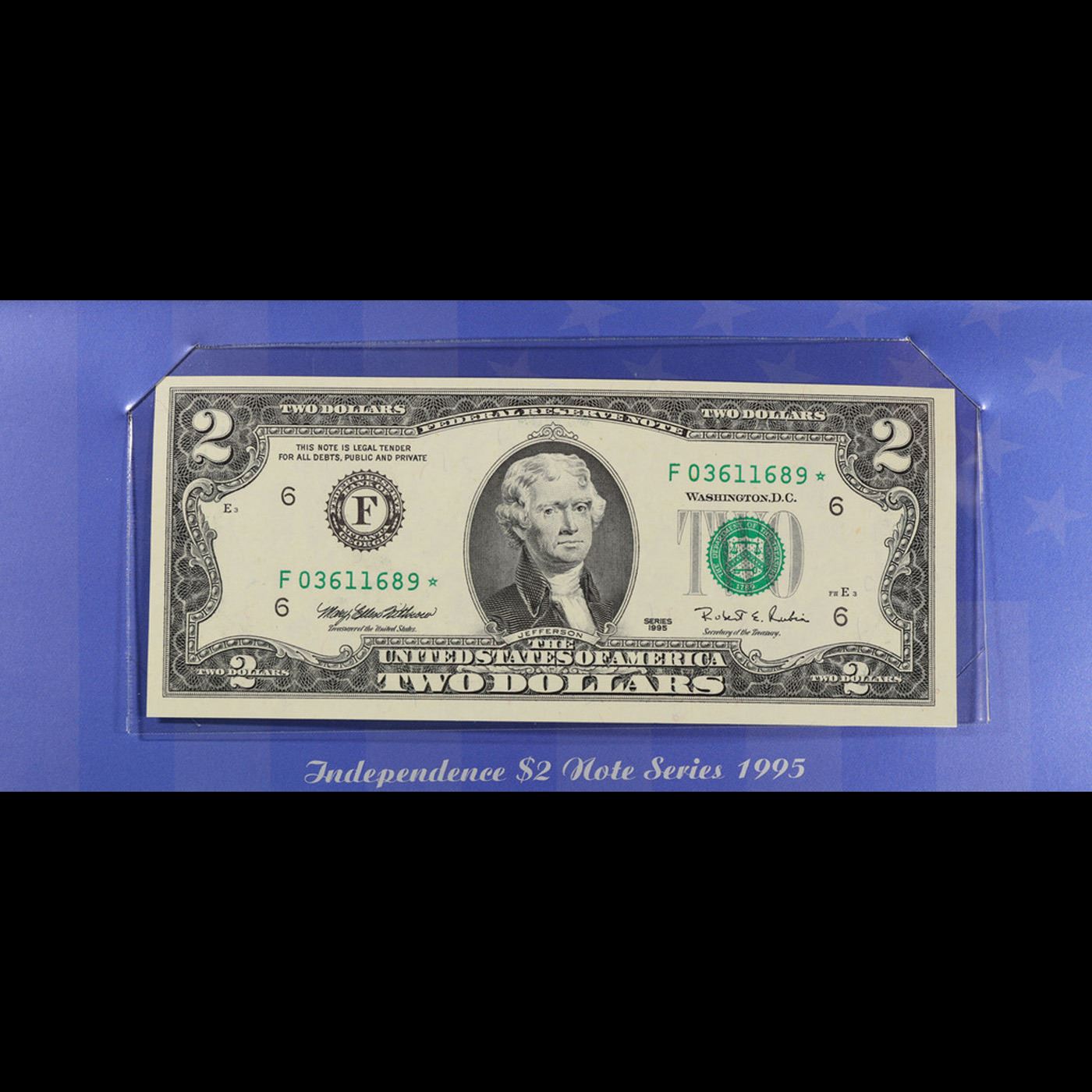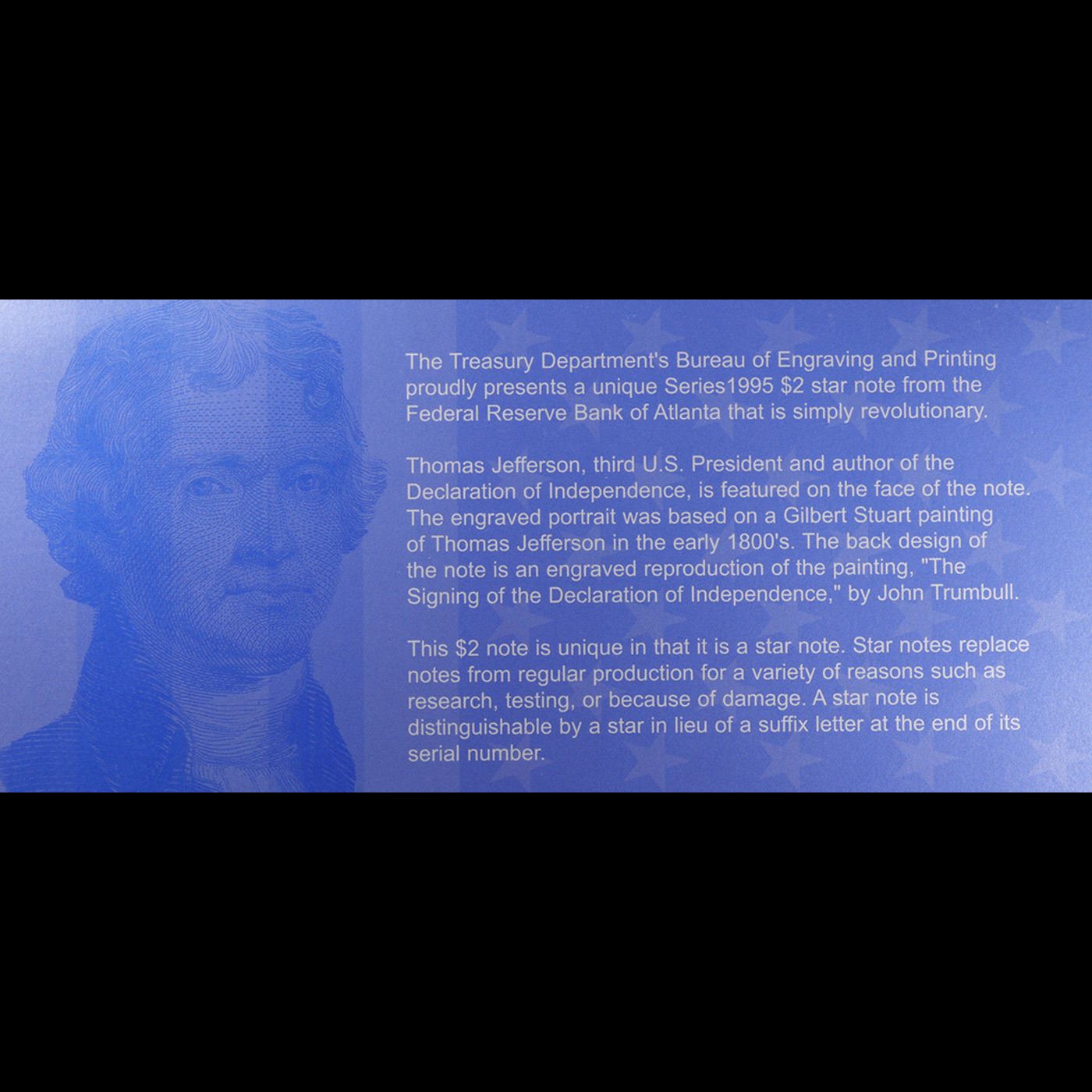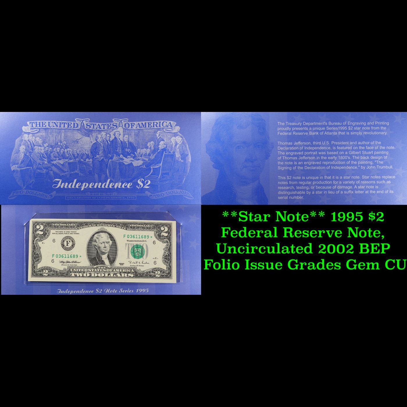**Star Note** 1995 $2 Federal Reserve Note, Uncirculated 2002 BEP Folio Issue Grades Gem CU.