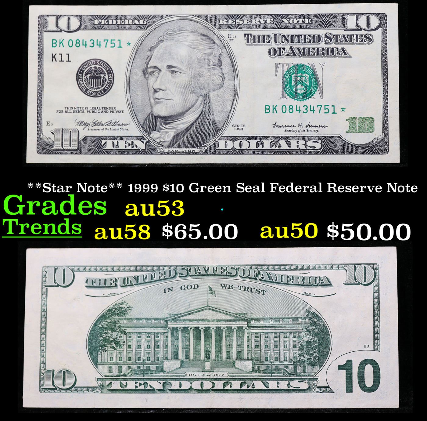 **Star Note** 1999 $10 Green Seal Federal Reserve Note Grades Select AU.