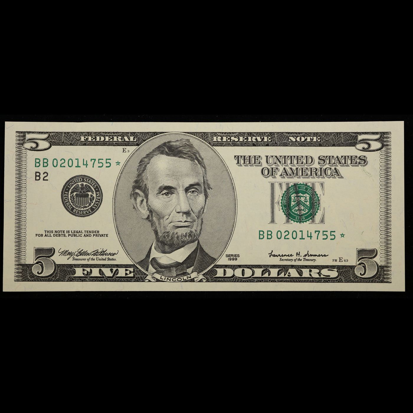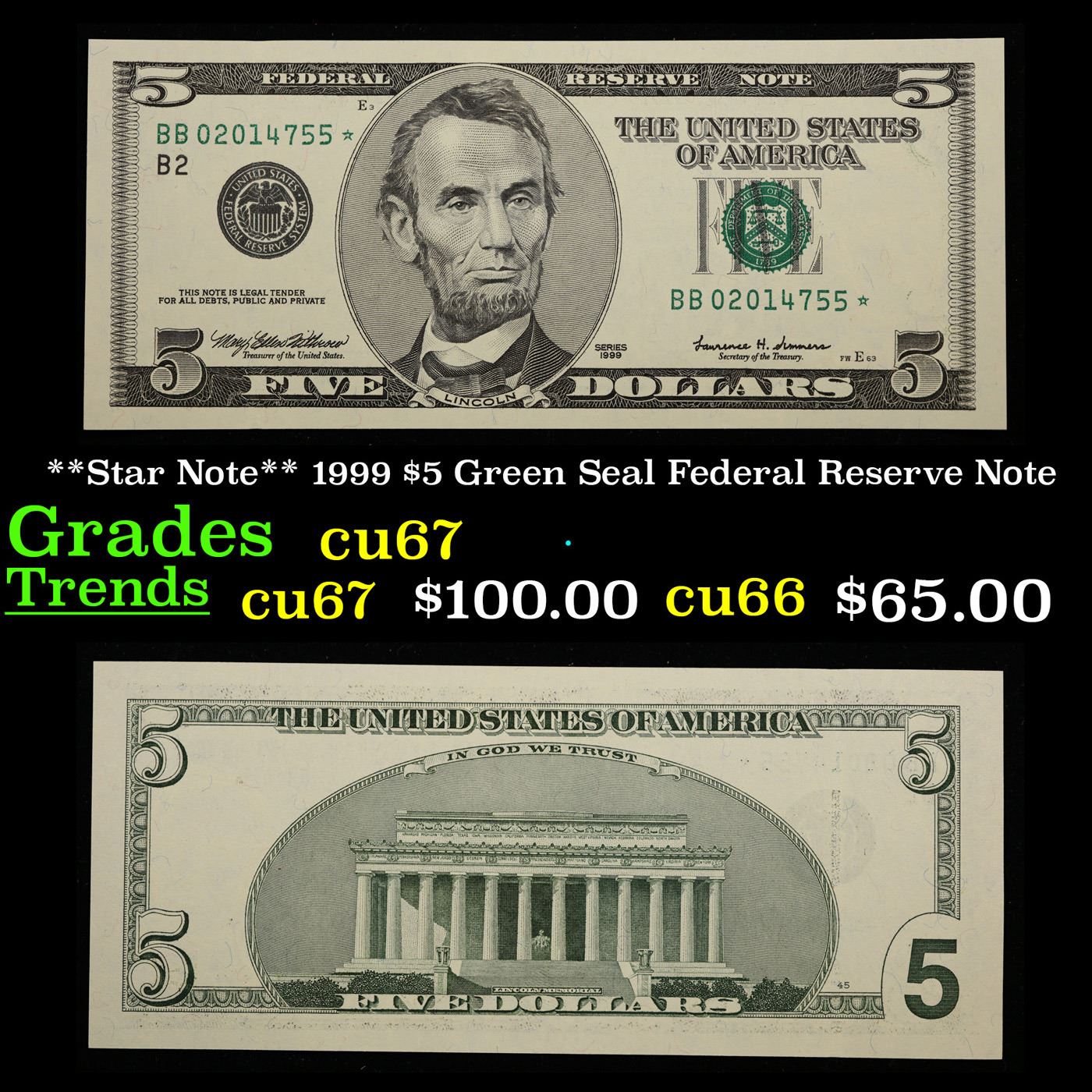 **Star Note** 1999 $5 Green Seal Federal Reserve Note Grades Gem++ CU.