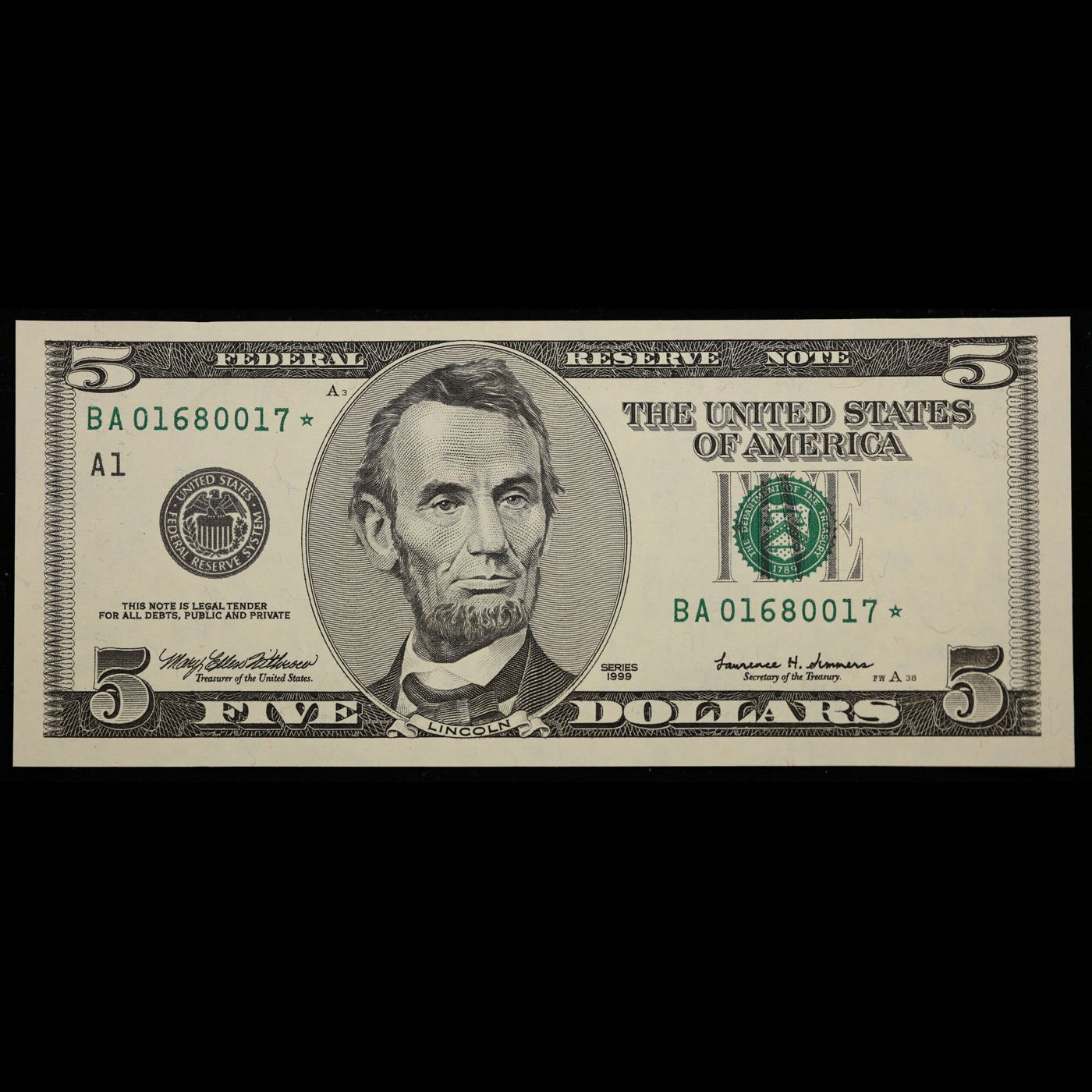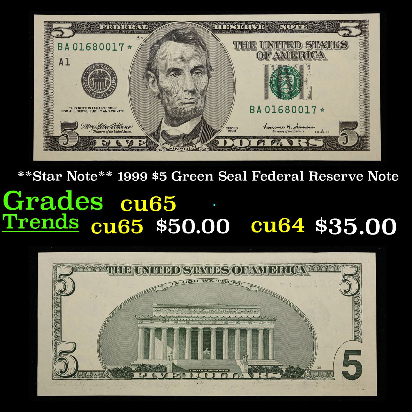 **Star Note** 1999 $5 Green Seal Federal Reserve Note Grades Gem CU.