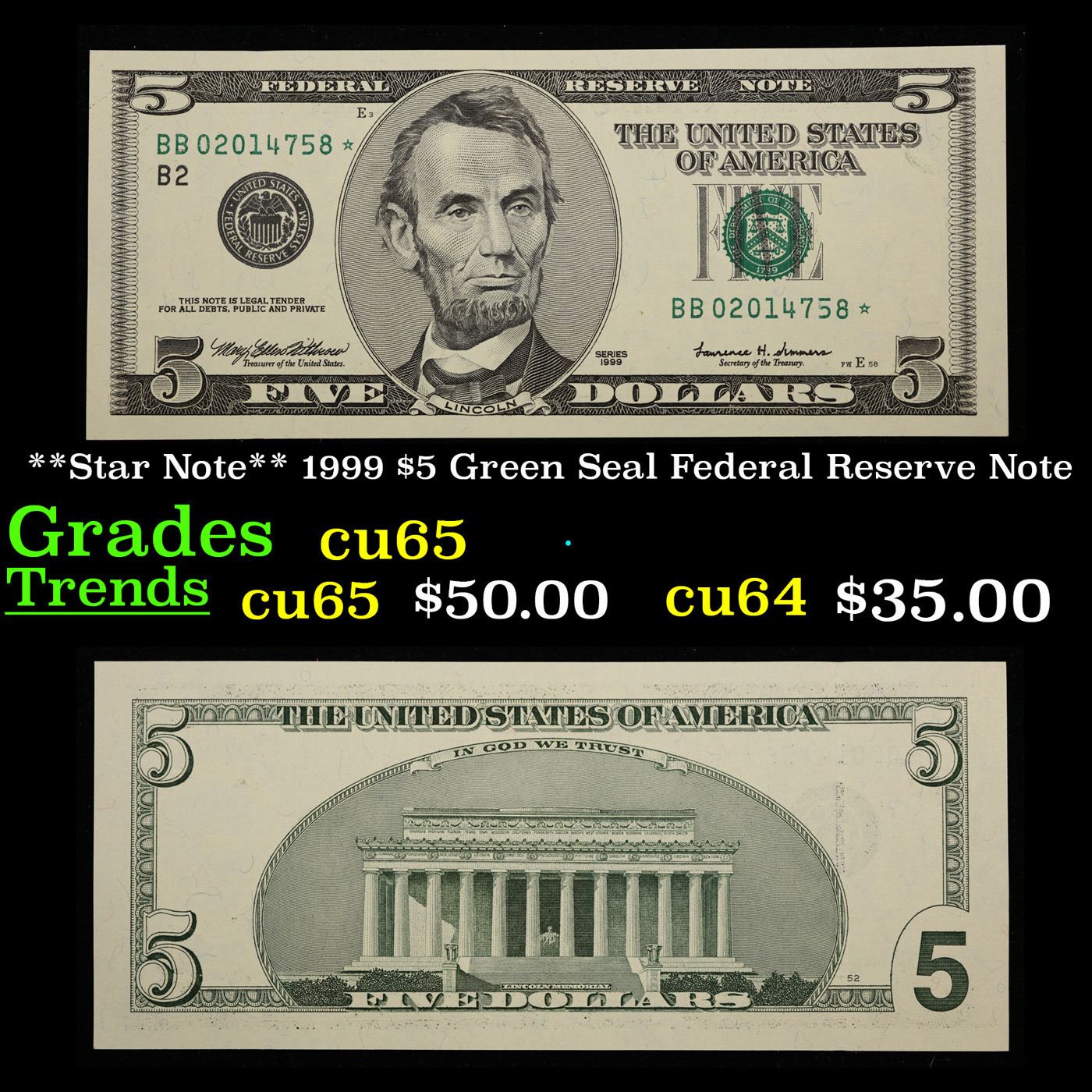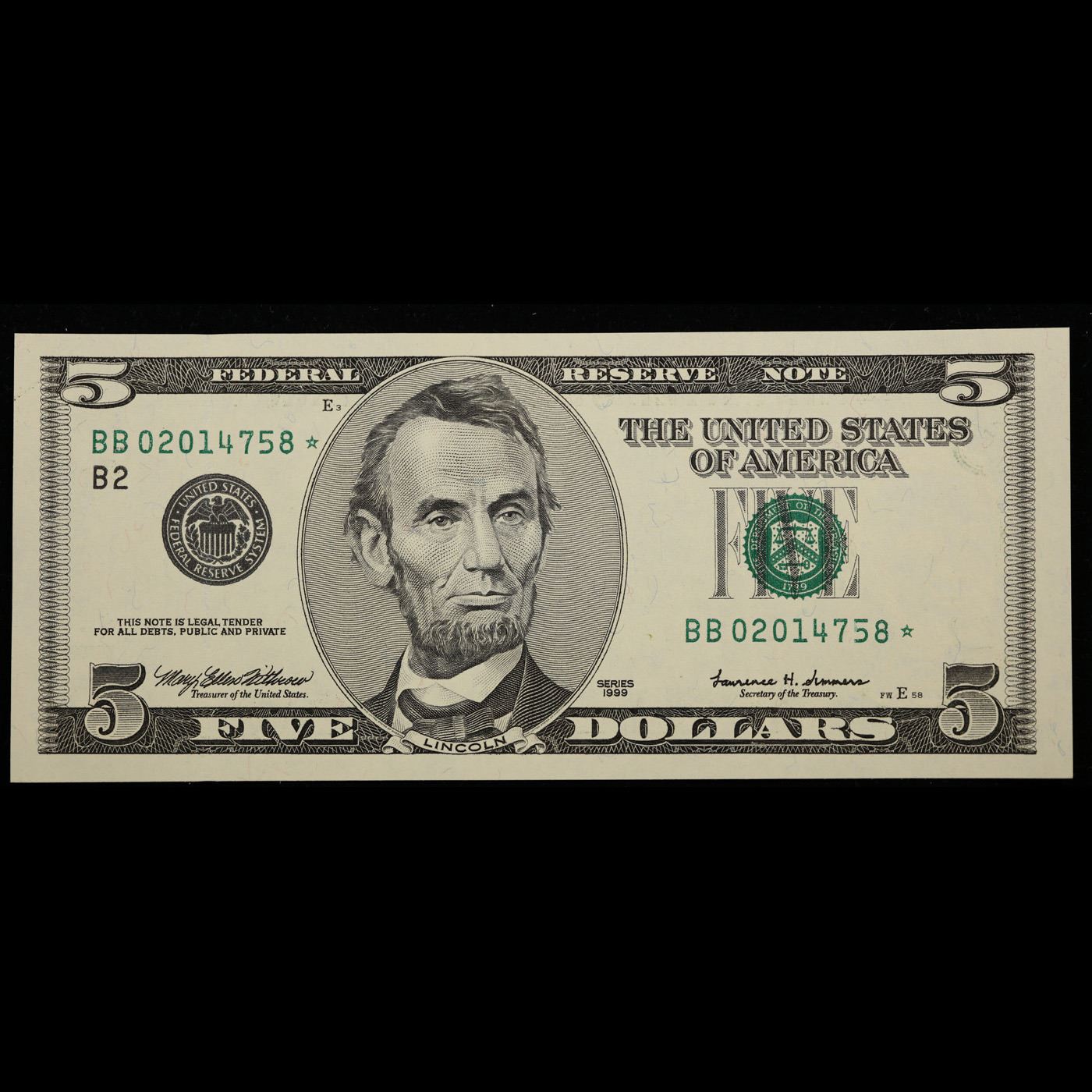 **Star Note** 1999 $5 Green Seal Federal Reserve Note Grades Gem CU.