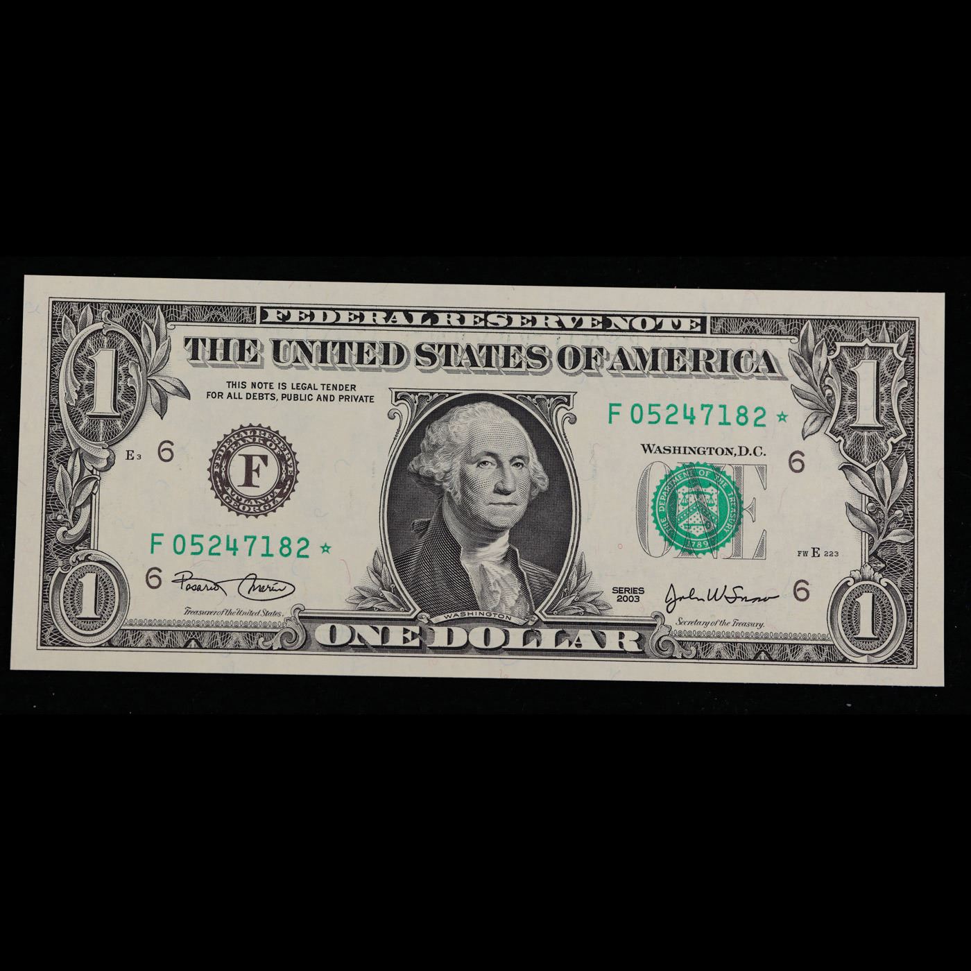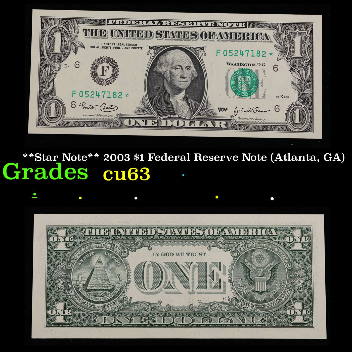 **Star Note** 2003 $1 Federal Reserve Note (Atlanta, GA) Grades Select CU. When notes are discovered that have been printed incorrectly (such as having the serial numbers upside down, etc.) the misprinted "error notes" are replaced with star notes because no two bills within a certain series can be produced with the same serial number. They are used to maintain a correct count of notes in a serial number run. By their nature, star notes are more scarce than notes with standard serial numbers and as such are widely collected by numismatists. Some of the highest prices paid for modern (post-1928) U.S. banknotes have been for star notes. The note itself is a Silver Certificate. Silver Certificates were redeemable in Silver. One of their most distinctive qualities is the blue Treasury seal and serial numbers. These notes include an additional legend printed on the face that is not present on any other Federal Reserve notes. The legend states that Silver had been deposited in the Treasury and was payable on demand to the note’s bearer.
