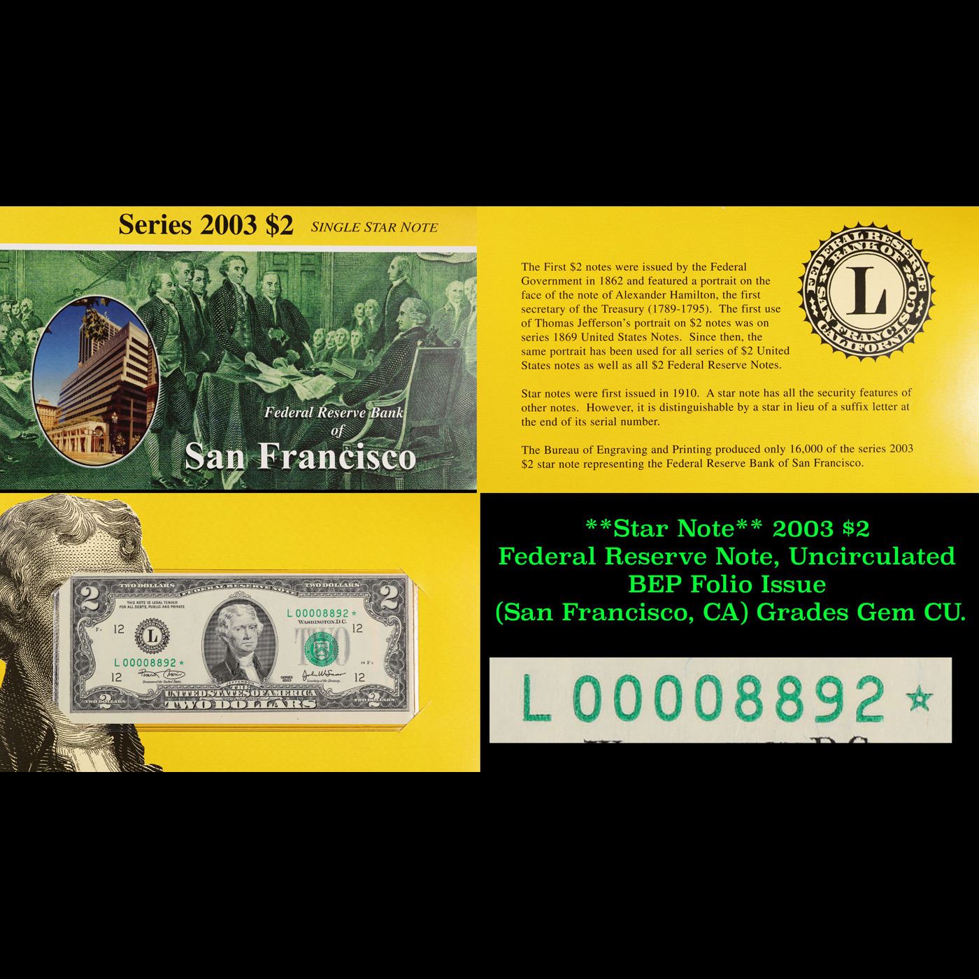 **Star Note** 2003 $2 Federal Reserve Note, Uncirculated BEP Folio Issue (San Francisco, CA) Grades Gem CU.