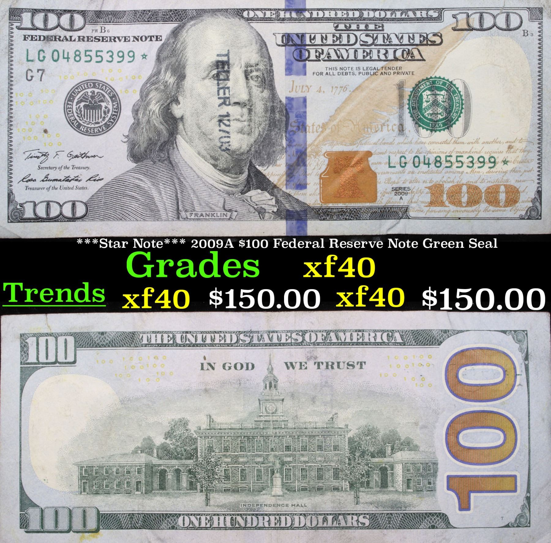 ***Star Note*** 2009A $100 Federal Reserve Note Green Seal Grades xf. When notes are discovered that have been printed incorrectly (such as having the serial numbers upside down, etc.) the misprinted "error notes" are replaced with star notes because no two bills within a certain series can be produced with the same serial number. They are used to maintain a correct count of notes in a serial number run. By their nature, star notes are more scarce than notes with standard serial numbers and as such are widely collected by numismatists. Some of the highest prices paid for modern (post-1928) U.S. banknotes have been for star notes.