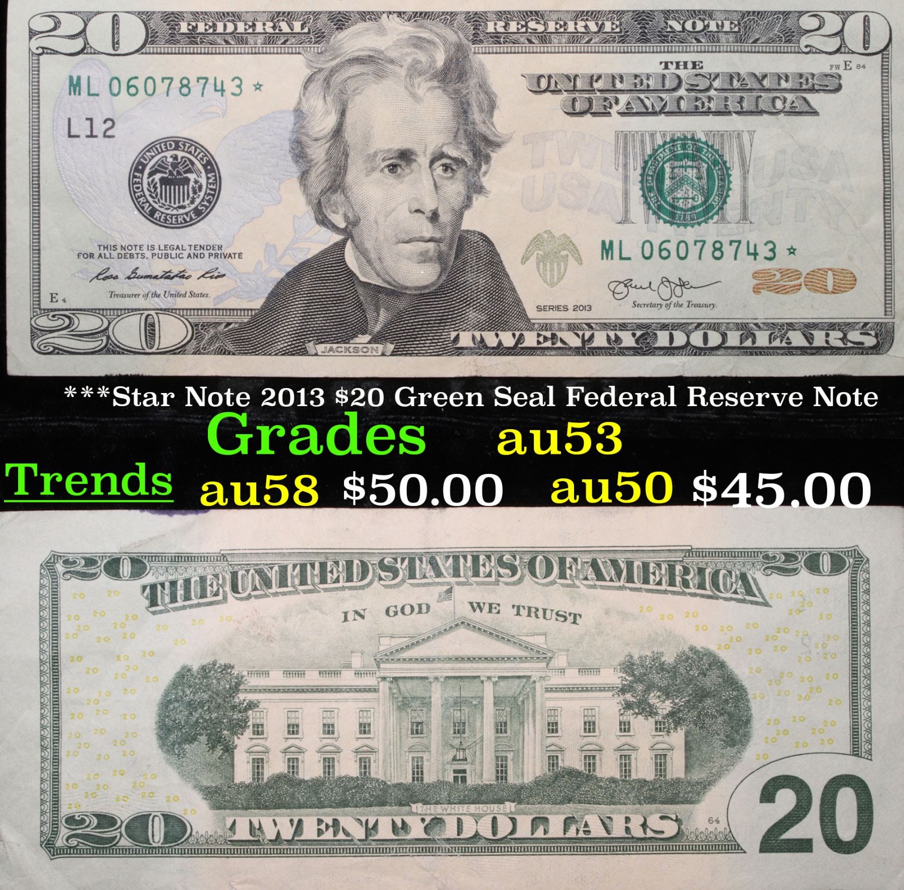 ***Star Note 2013 $20 Green Seal Federal Reserve Note Grades Select AU. When notes are discovered that have been printed incorrectly (such as having the serial numbers upside down, etc.) the misprinted "error notes" are replaced with star notes because no two bills within a certain series can be produced with the same serial number. They are used to maintain a correct count of notes in a serial number run. By their nature, star notes are more scarce than notes with standard serial numbers and as such are widely collected by numismatists. Some of the highest prices paid for modern (post-1928) U.S. banknotes have been for star notes. This Note Was Printed in October of 2015