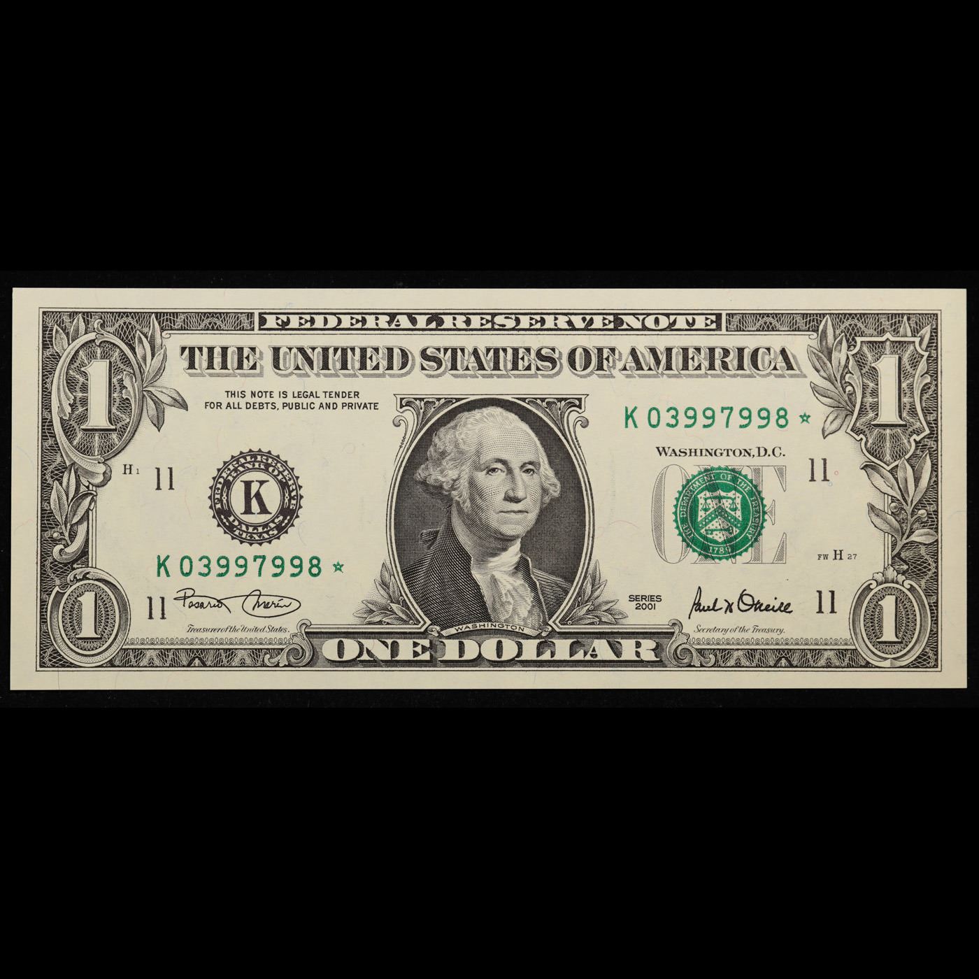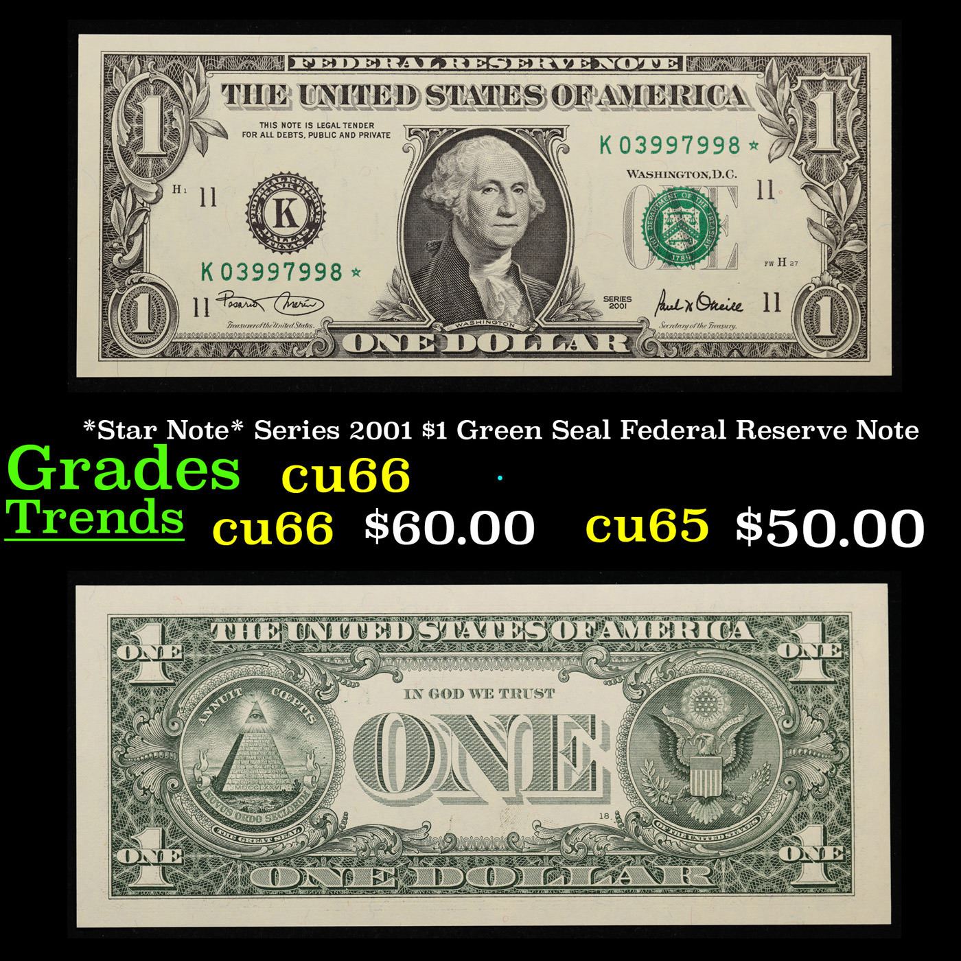 *Star Note* Series 2001 $1 Green Seal Federal Reserve Note Grades Gem+ CU. The 2001 series $1 bills were printed at two different locations- Washington D.C. and Fort Worth, Texas. The location can affect the value. Notes printed in Fort Worth, Texas can be identified by a small "FW" on the front of the bill next to the green seal. Star notes are replacement bills that the United States Federal Reserve printed. These star notes are more rare and thus more valuable. You can tell if you have a star note by looking to see if there is a star symbol at the end of the serial number.