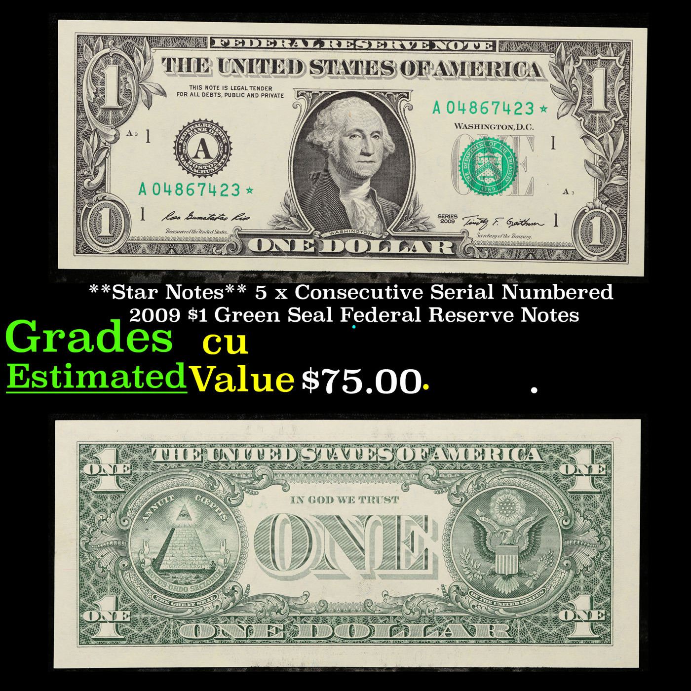 **Star Notes** 5 x Consecutive Serial Numbered 2009 $1 Green Seal Federal Reserve Notes Grades CU