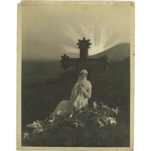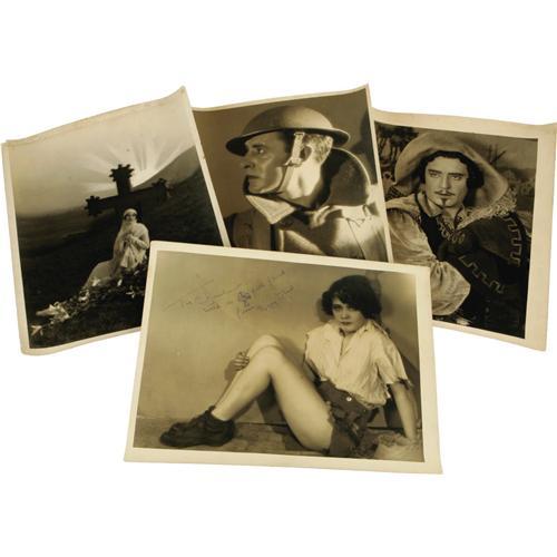 <B>Star Photo Group of 4 Including Sally O'Neill Autographed Portrait and John Gilbert Pictures.</B></I> This lot features a charming autographed 11" x 14" portrait of a leggy Sally O' 'Neill, star of such films as <I>Jazz Heaven</B></I> (1929) and <I>The Brat</B></I> (1931). Ms. O'Neill has signed in blue ink and added a shamrock to her inscription. Also included are two wonderful 11" x 14" portraits of John GIlbert, one from <I>The Big Parade</B></I> and another in medieval costume and makeup from an unidentified film. As a bonus, included is a beautiful 11" x 14" study of an unidentified actress seated by a cross with flowers and an Expressionistic sunrise behind her. <I>The Big Parade</B></I> photo and the unidentified actress picture have the name of photographer Ruth Harriet Louise embossed in the lower border and her Metro-Goldwyn-Mayer stamp on the verso. Some age border staining - overall Very Fine condition.<BR><BR><b>Shipping:</b> Flat Material, Small (<a target="_blank" href="http://www.heritageauctions.com/common/shipping.php">view shipping information</a>)