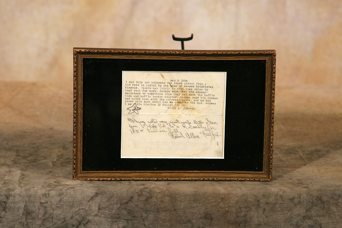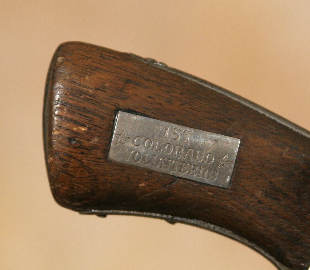 Star Revolver With Buffalo Hide Holster. 8" barrel, .44 calibre. Silver plate on grip reads: 1ST COLORADO VOLUNTEERS. Circa 1864. Holster is sinew sewn. Used by the Ute scout "Many Stars" for the attack on Black Kettles Band at Sand Creek. With 1934 letter of purchase. (est. $4,000-6,000). CONDITION REPORTS: www.auctioninsantafe.com/docs/cr2012.pdf